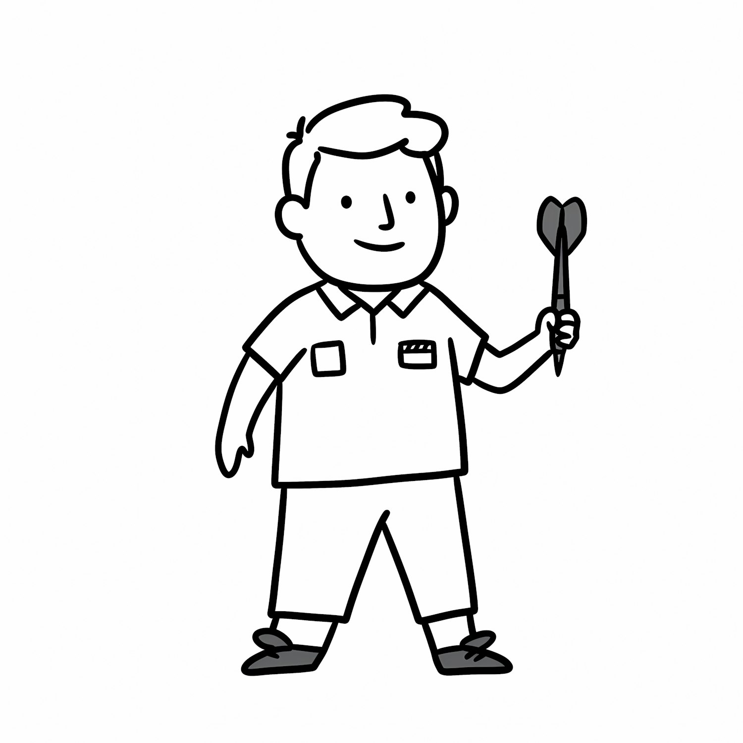 A simple black-and-white cartoon illustration of a boy holding a dart, drawn in a clean and minimalistic style.