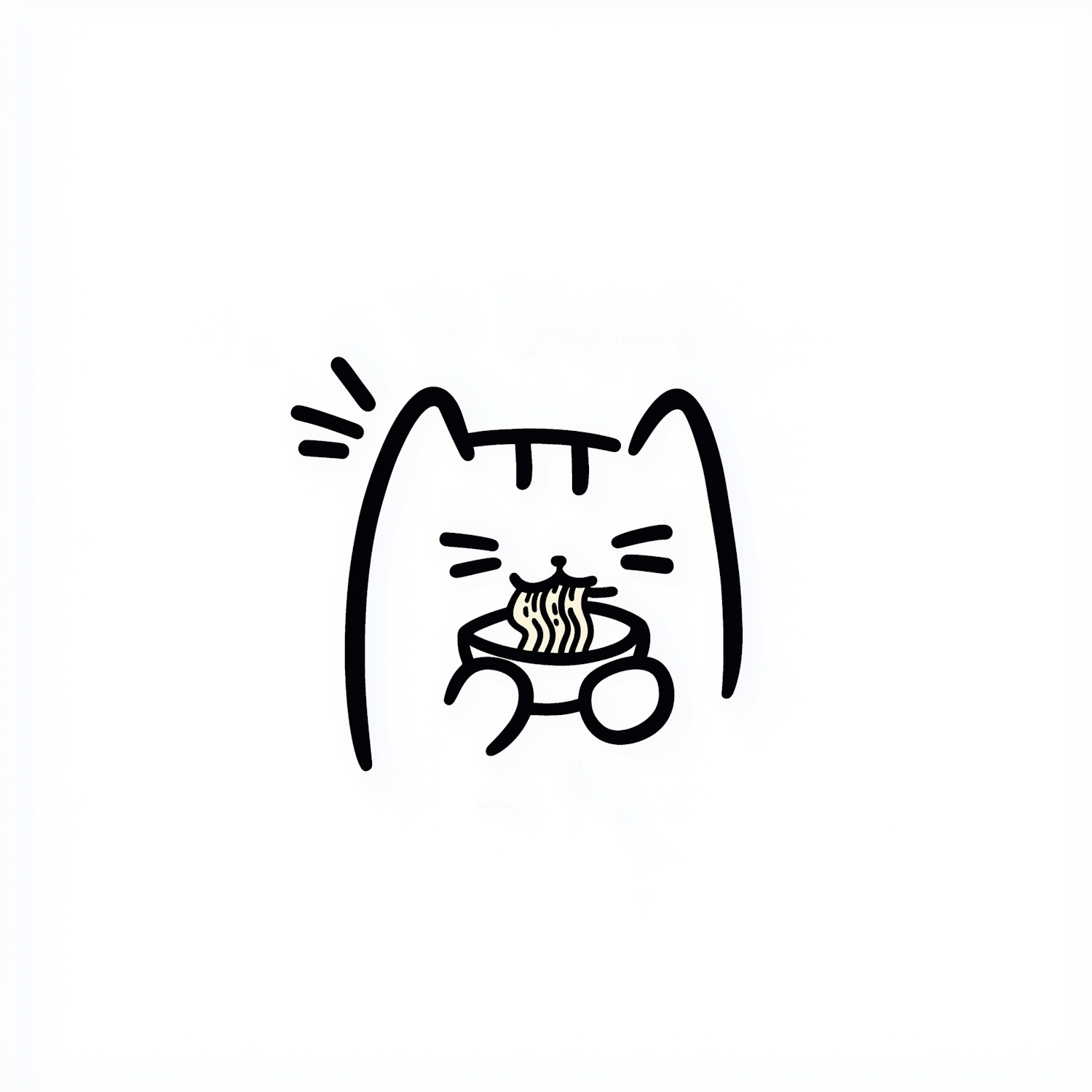 Adorable minimalist cartoon cat savoring a bowl of steaming noodles, perfect for food and animal lovers alike.