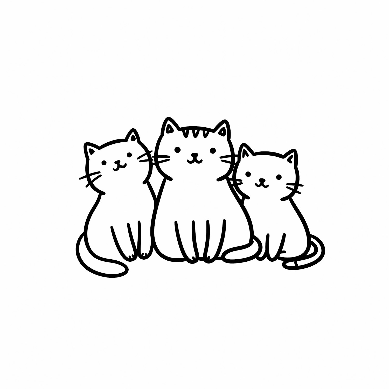 A charming black-and-white line drawing of three cartoon cats sitting together, showcasing a minimalist and adorable design.