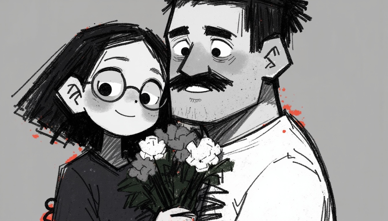Charming illustration of a girl with glasses and a man with a mustache, sharing a moment with a bouquet of flowers in hand.
