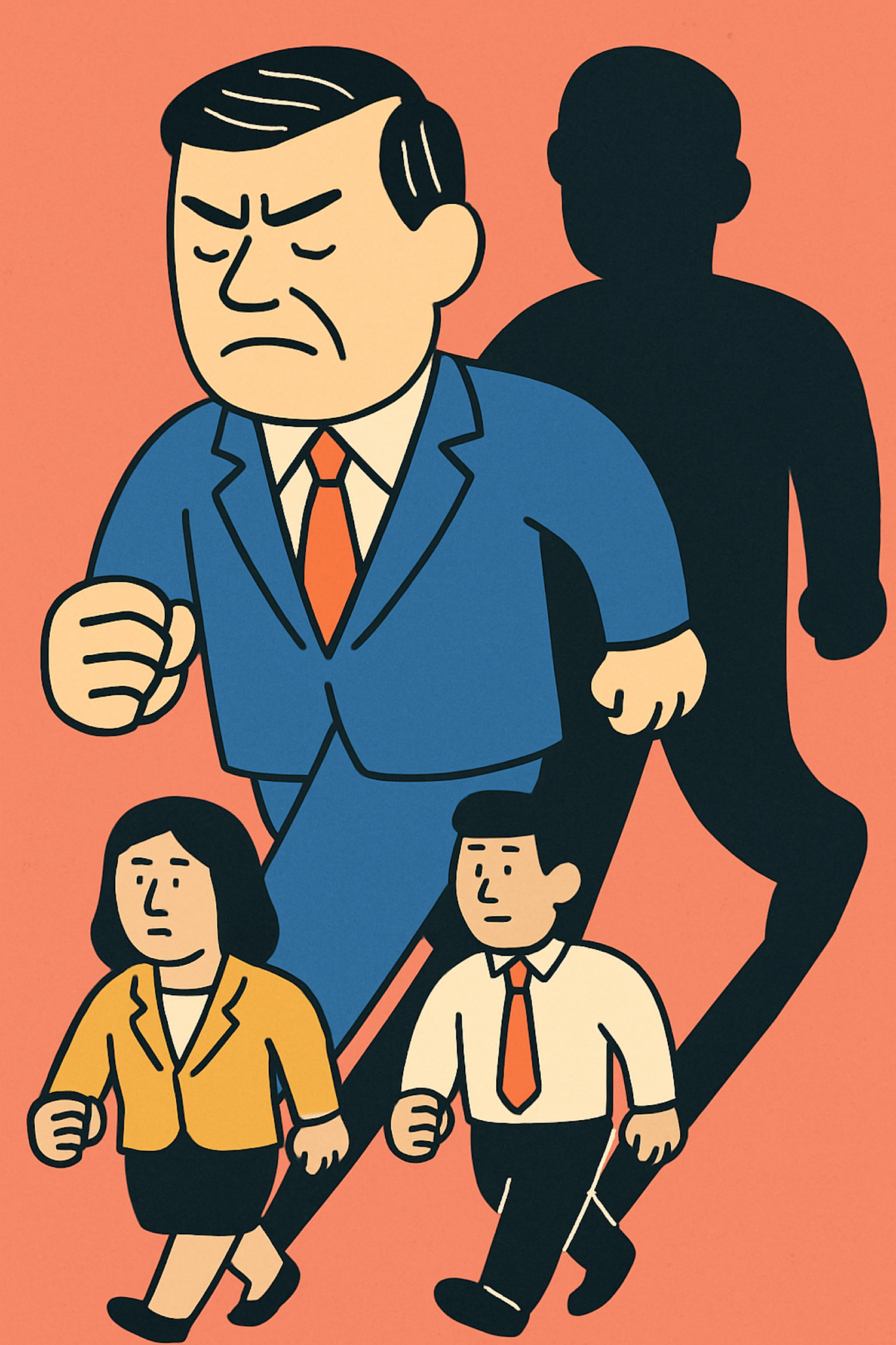 Cartoon illustration of a dominant man in a suit with two smaller figures walking beside him, set against a peach background.