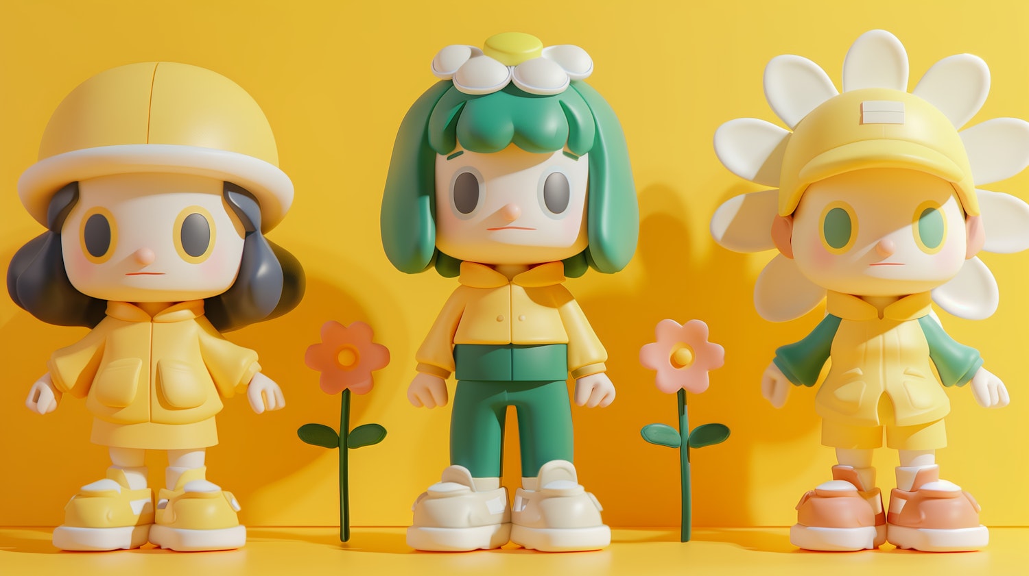 Three cute cartoon figures with flower-themed designs stand against a bright yellow background, showcasing playful and vibrant colors.