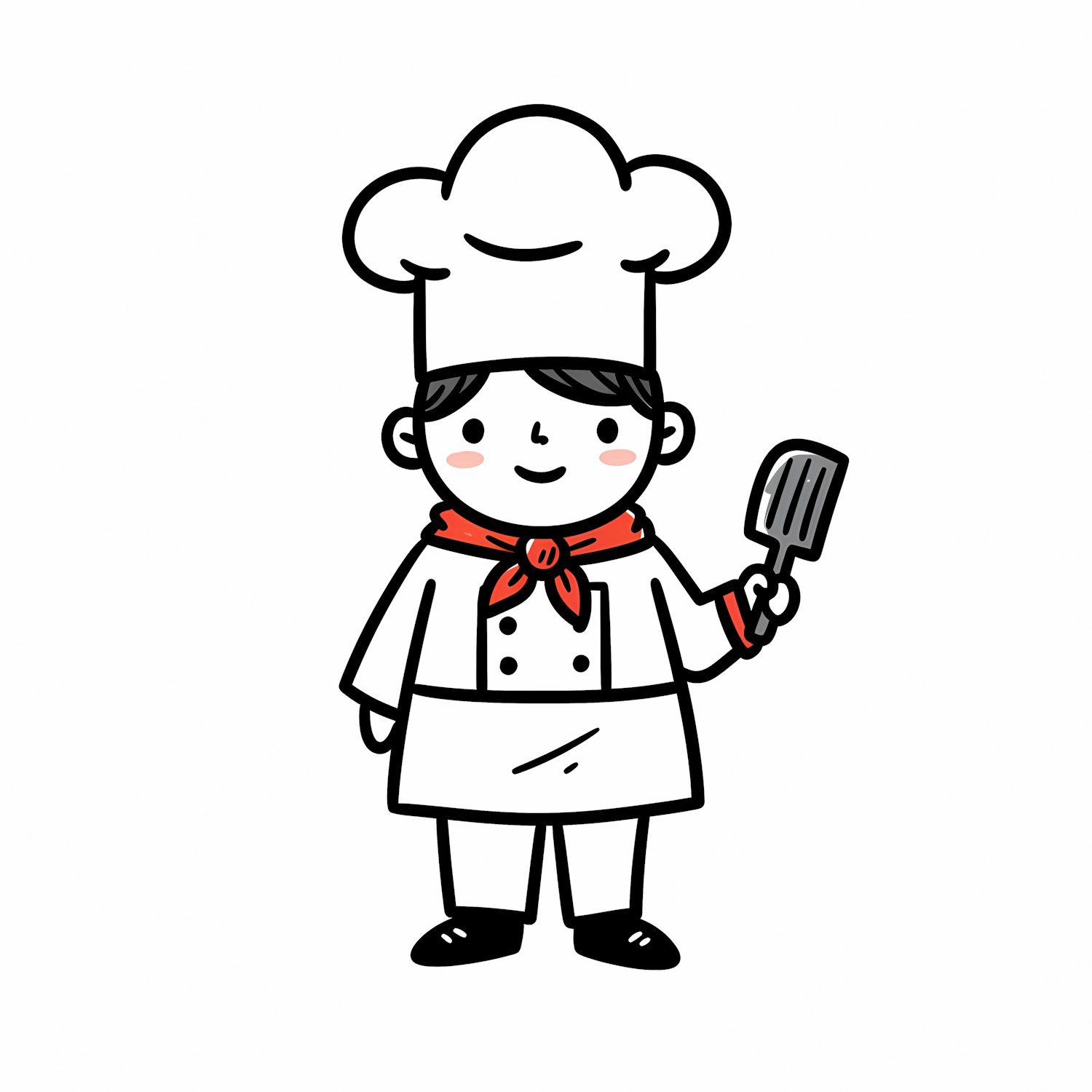 A cute cartoon chef in a white uniform and red scarf holding a spatula, drawn in a simple and bold illustration style.