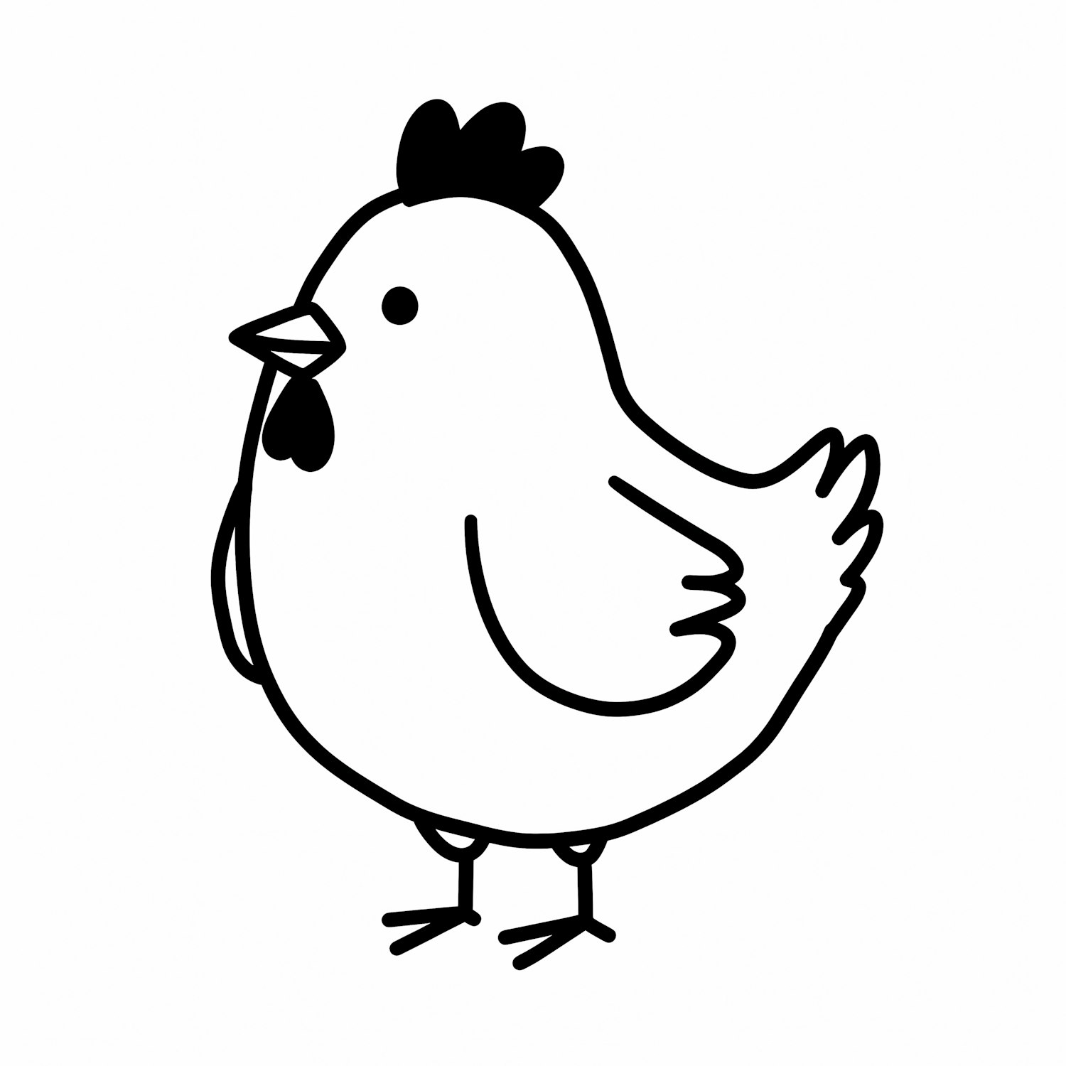 A minimalist black-and-white cartoon drawing of a chicken with a rounded body and simple features.