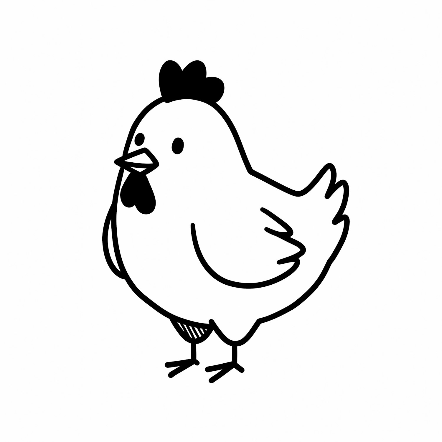 A minimalist black-and-white cartoon drawing of a chicken, featuring simple lines and a clean design, perfect for educational or creative use.