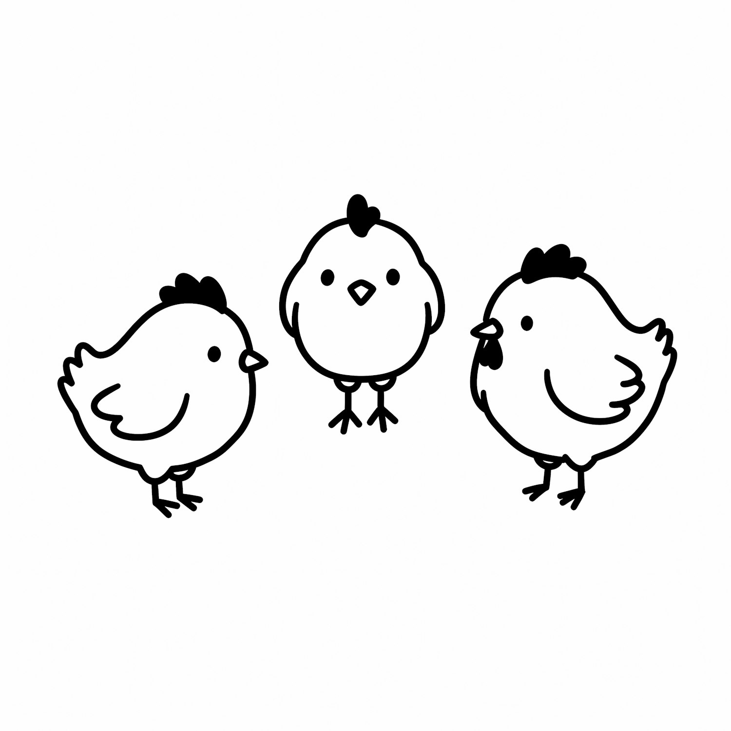 Minimalist black-and-white illustration of three cartoon chickens with rounded bodies and small wings, arranged in a triangular formation.