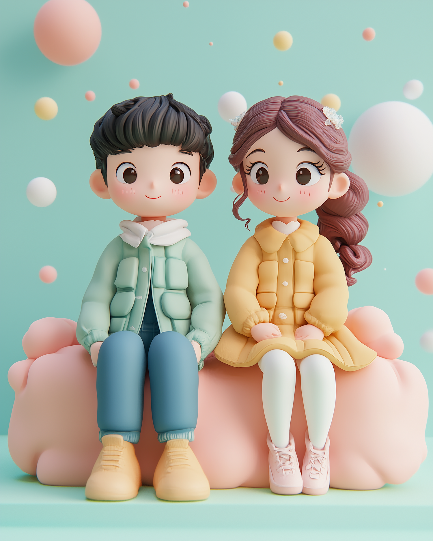 Adorable 3D cartoon boy and girl sitting on a pink cloud with pastel colors and floating spheres in a whimsical setting.