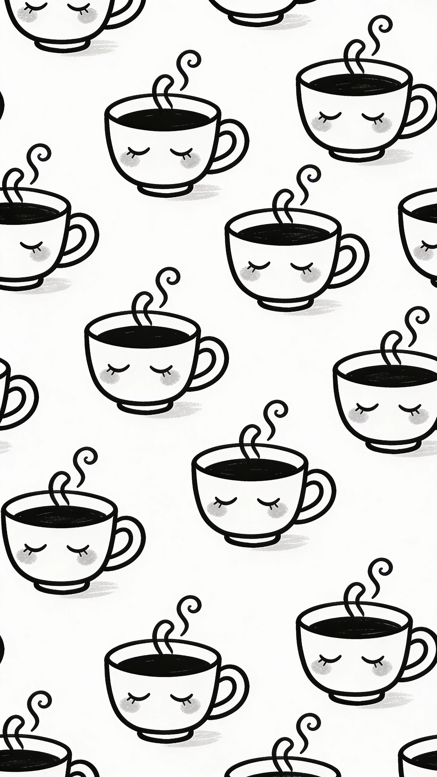 A seamless pattern of cute cartoon coffee cups with closed eyes and steam, set against a white background for a playful design.