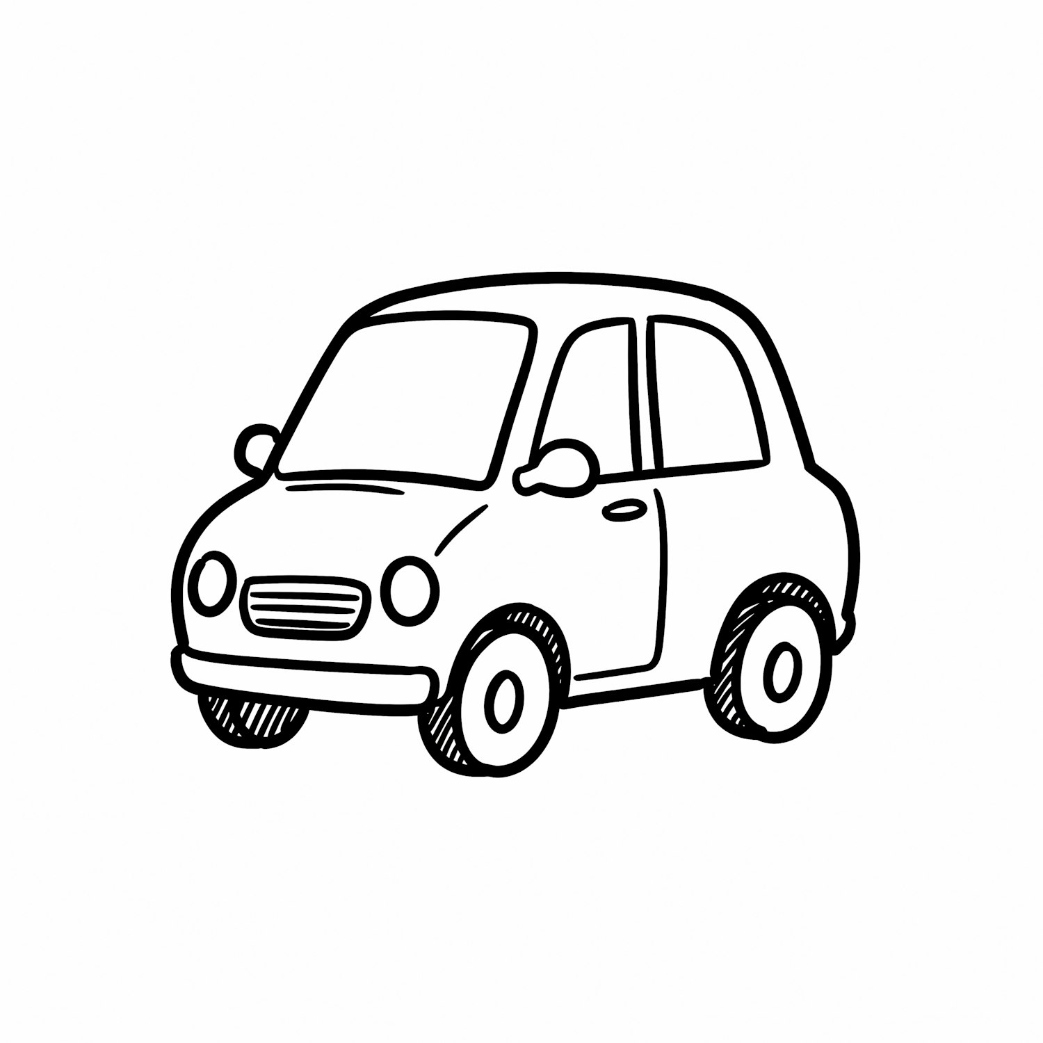 A charming black-and-white line drawing of a small, rounded car with a cartoonish style, perfect for coloring or design projects.