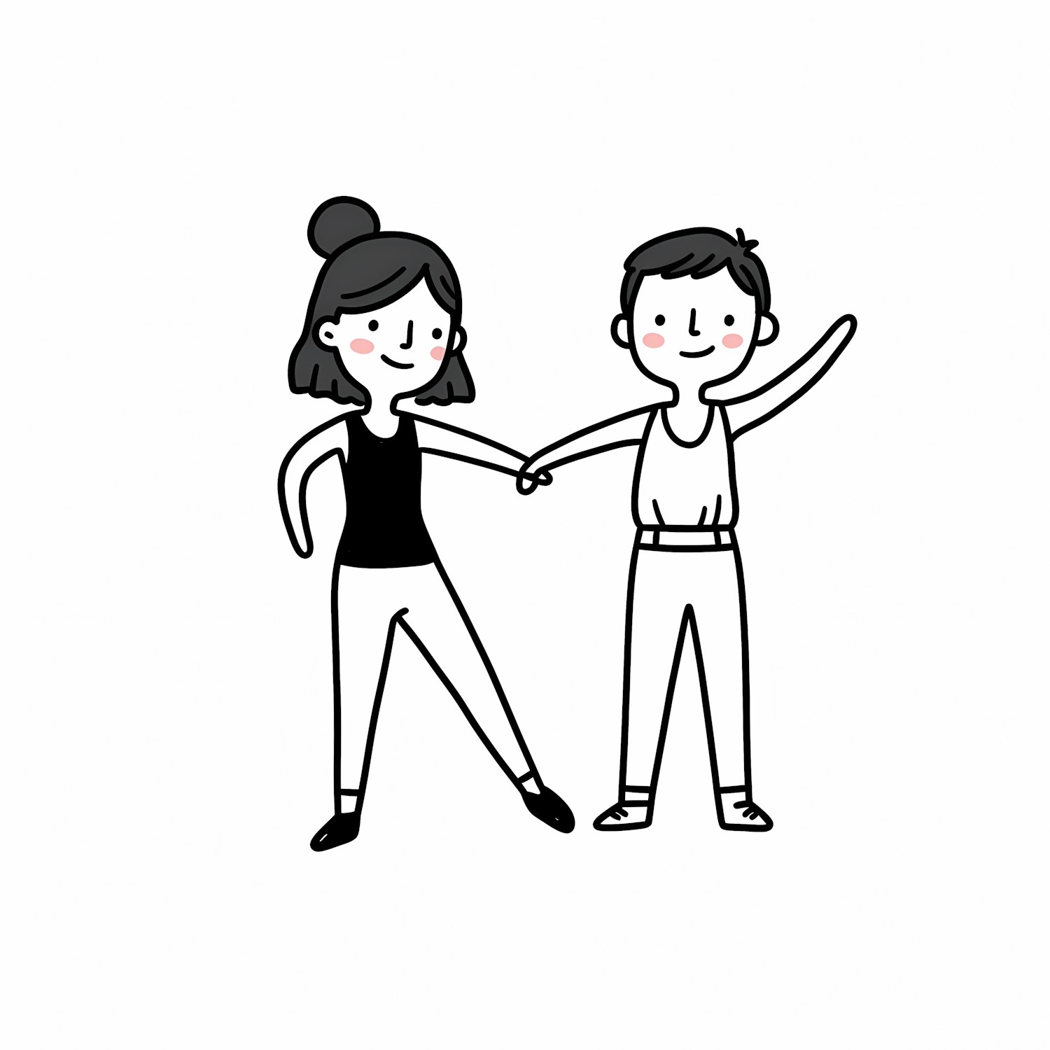 Minimalist cartoon illustration of two cheerful characters holding hands, showcasing friendship and joy on a plain white background.
