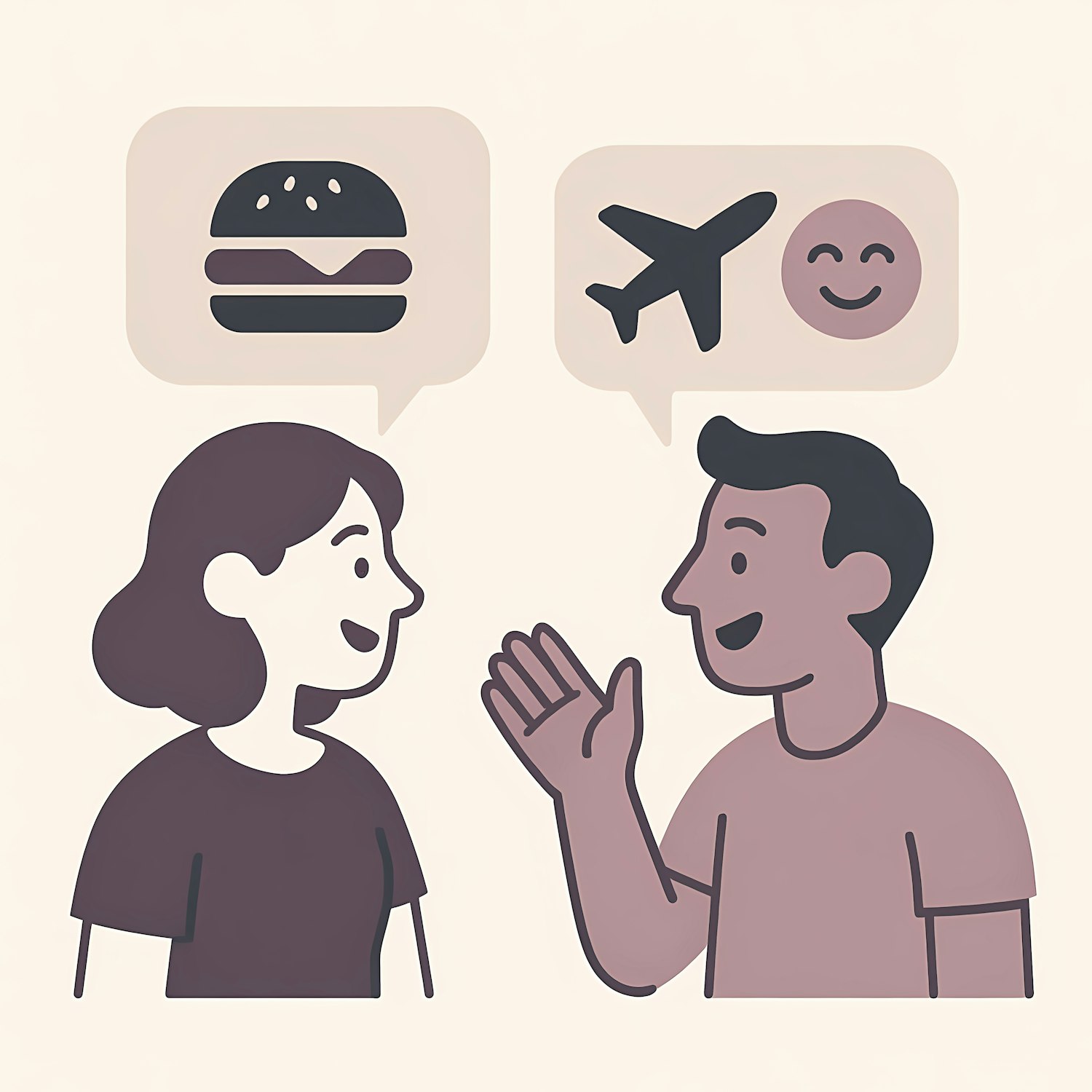 Cartoon-style illustration of two people chatting, with speech bubbles showing a burger, airplane, and smiley face. Fun and simple design.