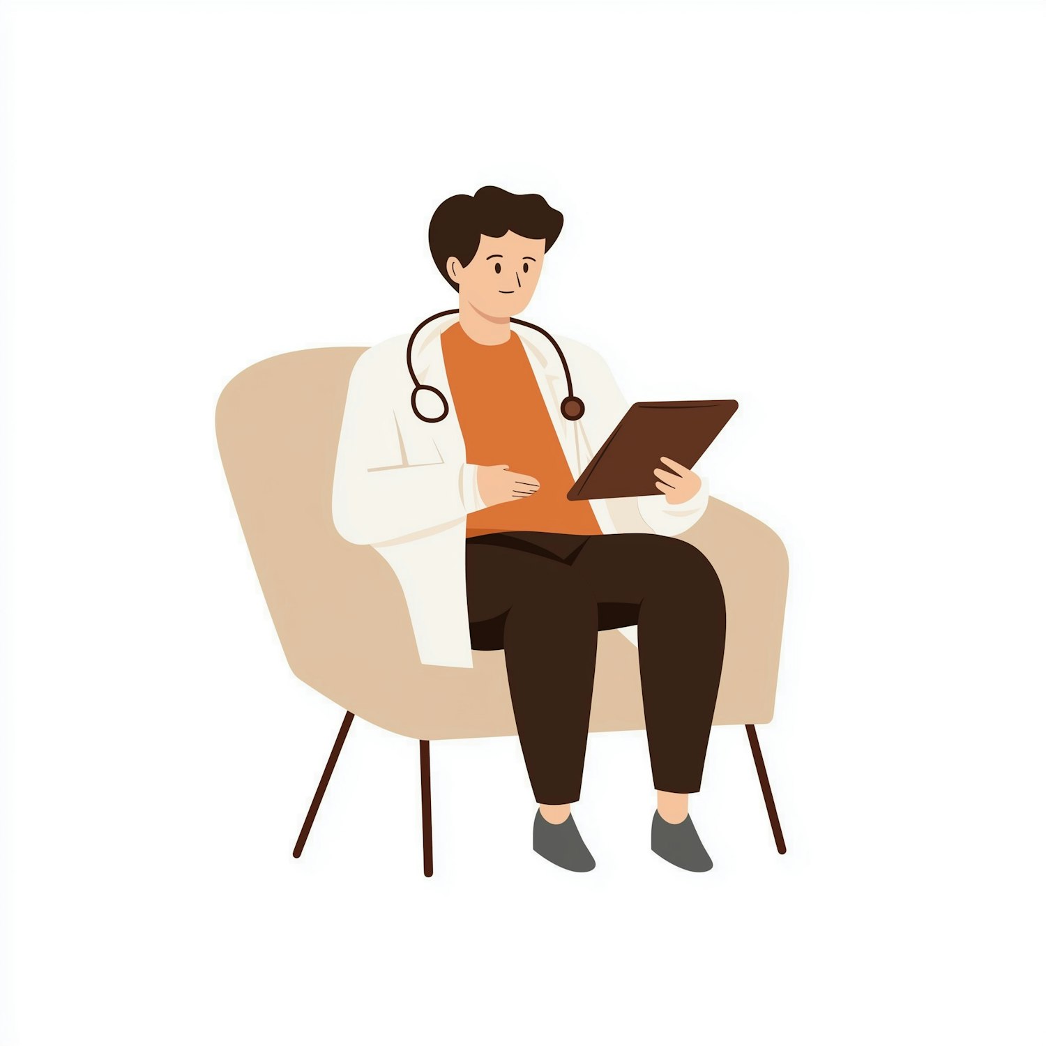 Illustration of a male doctor with a stethoscope, sitting on a chair and using a tablet, set against a clean white background.