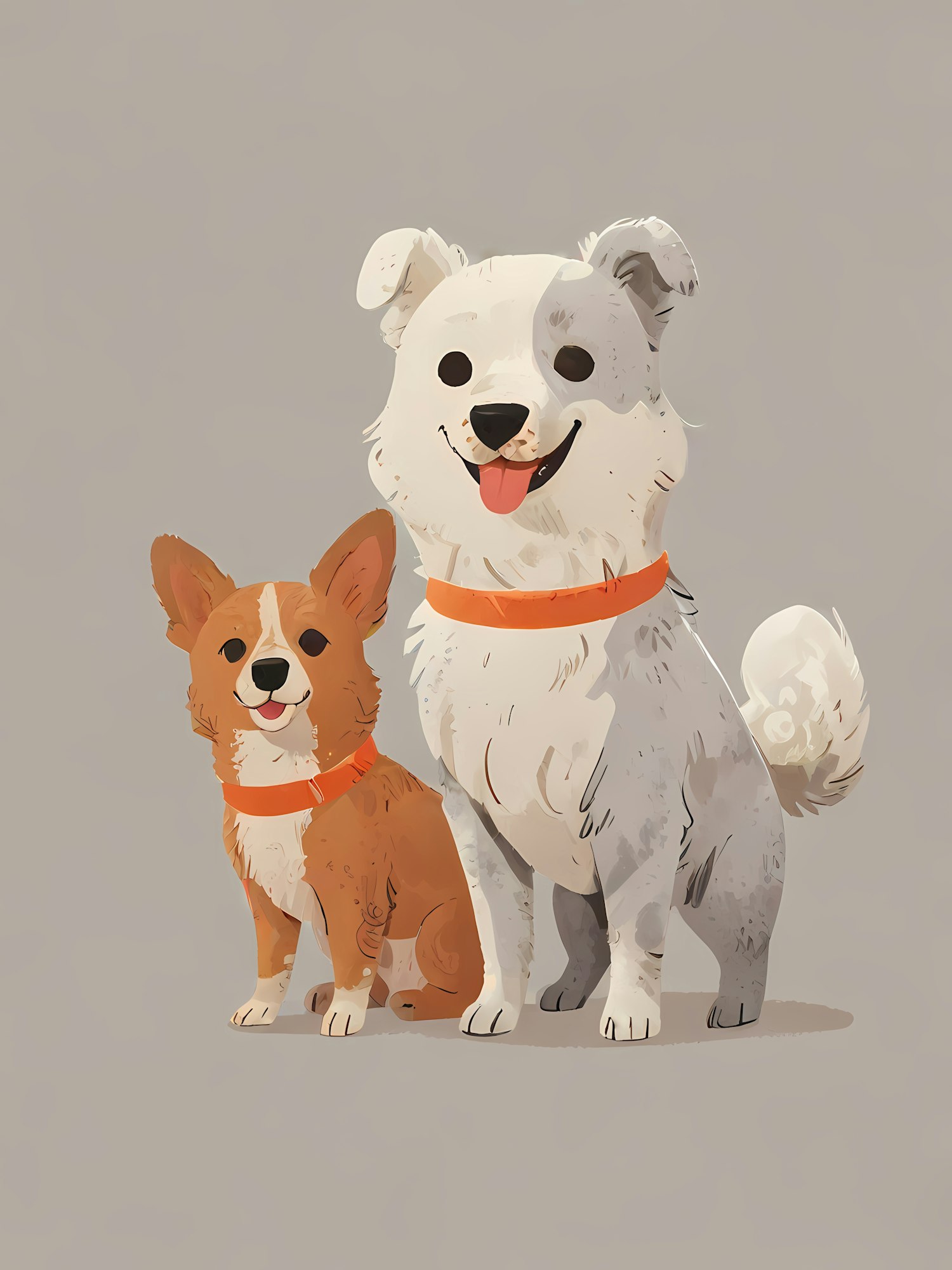 Charming illustration of a corgi and a fluffy dog with orange collars, showcasing their playful and friendly expressions.
