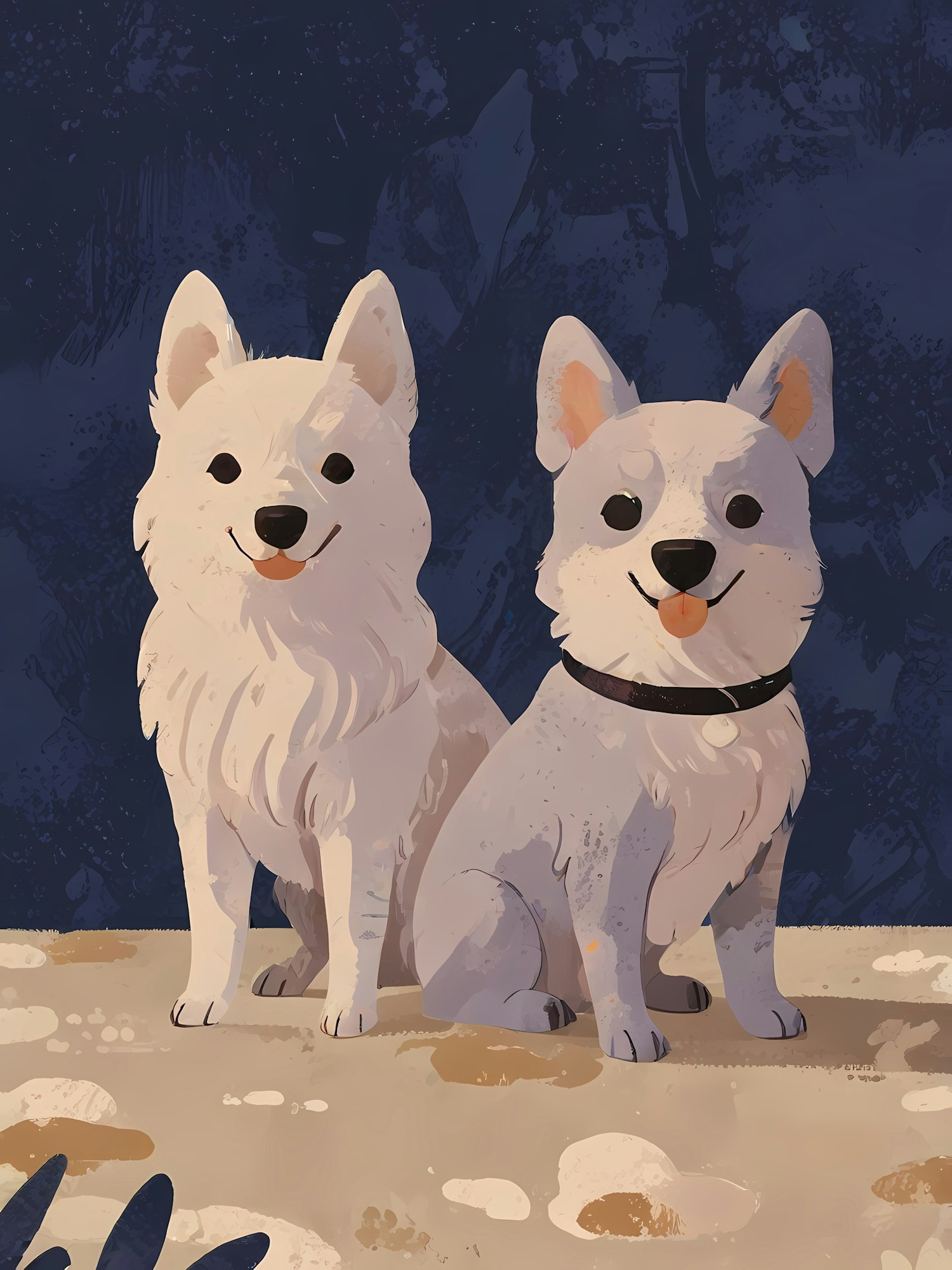 Two cartoon dogs with fluffy white coats sit side by side on a sandy surface, set against a dark blue background.