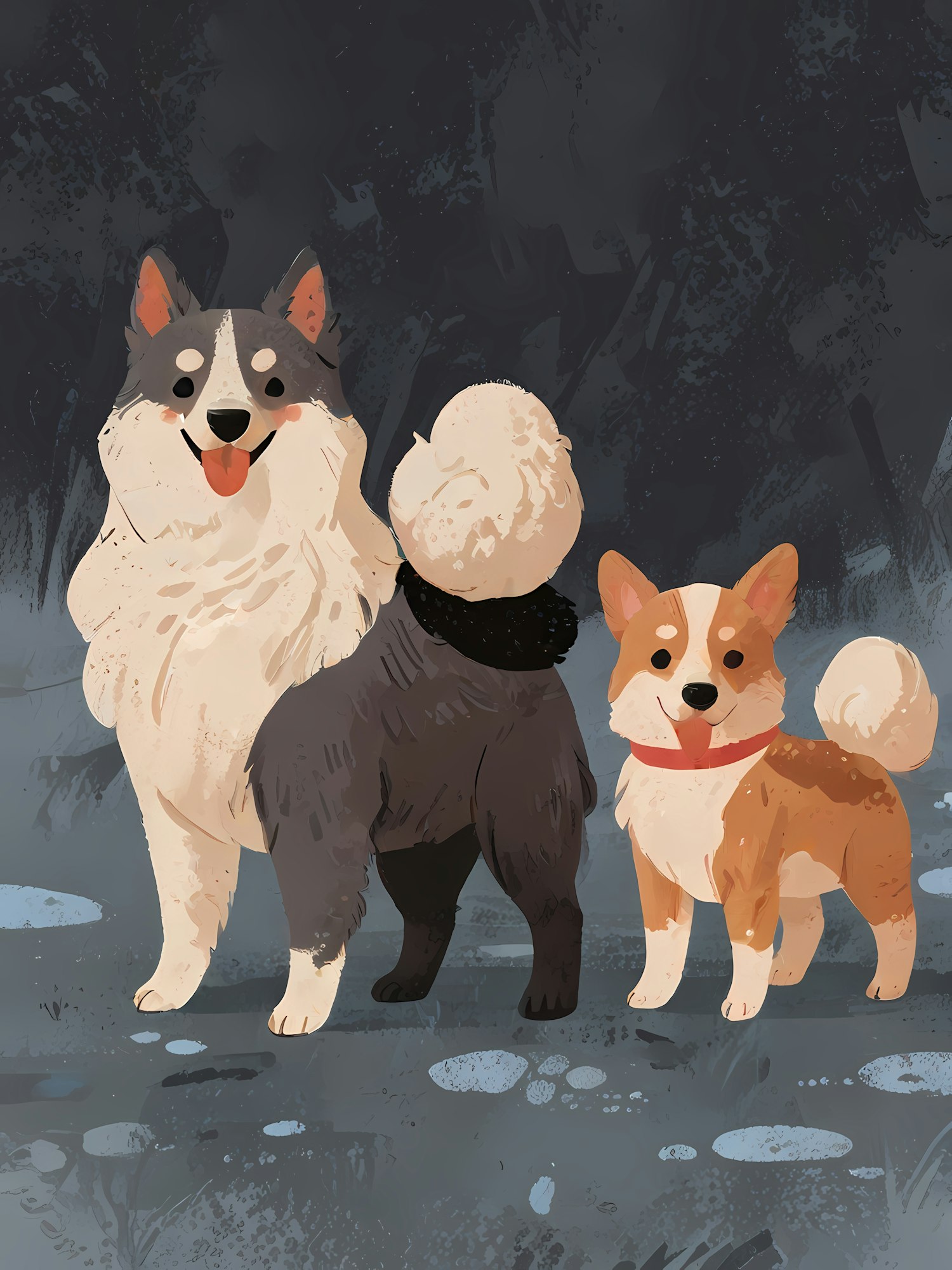 Charming illustration of two cartoon dogs with fluffy coats and cheerful expressions against a dark, textured background.