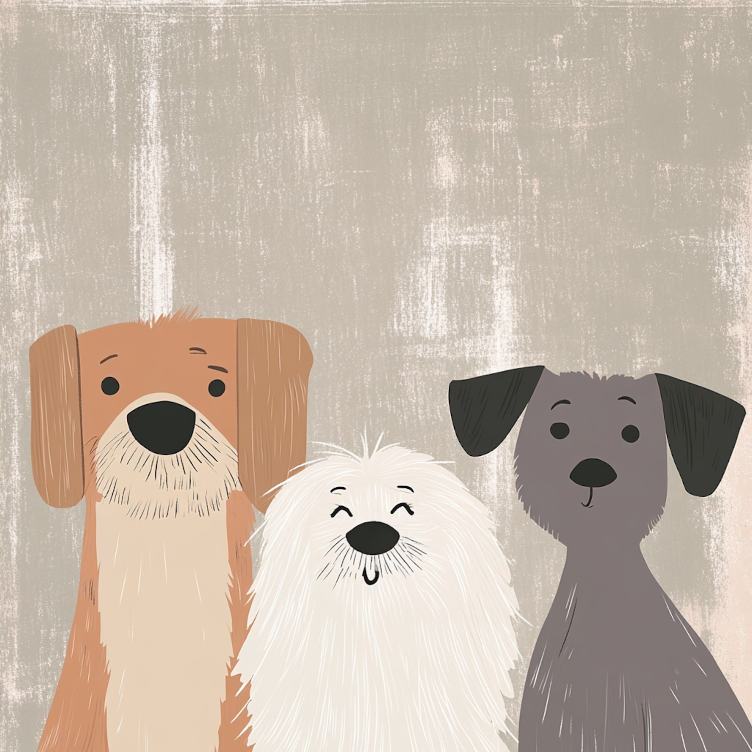 Charming illustration of three cartoon dogs with distinct colors and expressions on a textured gray background.