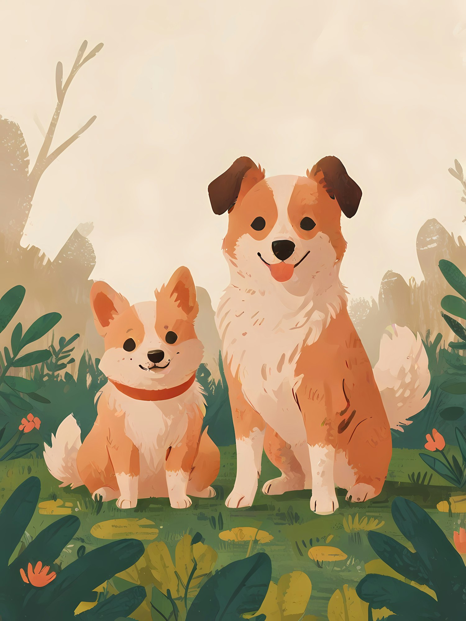 Charming illustration of two cartoon dogs in a lush, green field with flowers, exuding a playful and friendly vibe.