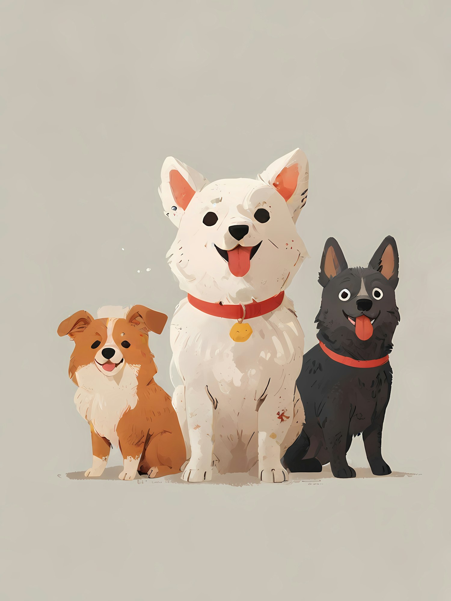 Three cartoon dogs sit happily with tongues out, featuring a brown, white, and black dog, each with a red collar, on a plain background.