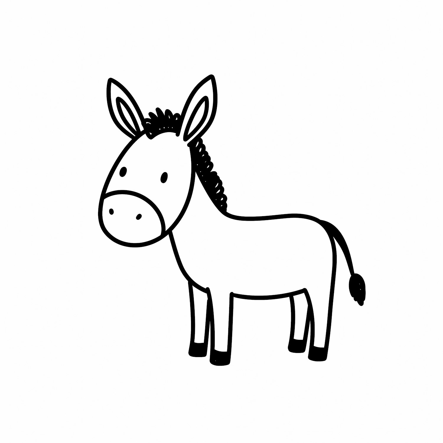 A minimalist black-and-white cartoon drawing of a donkey with bold lines and a playful design on a plain white background.