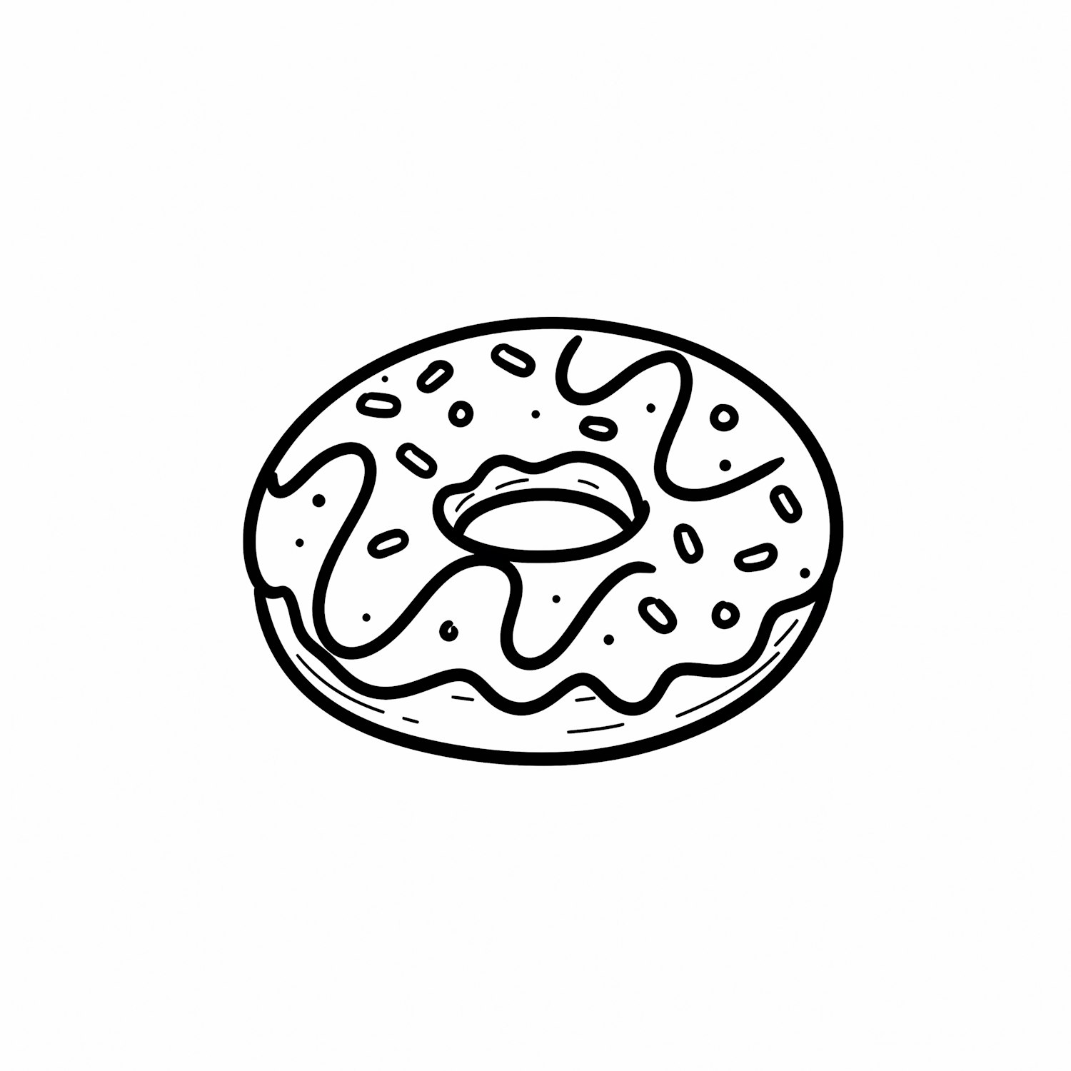 A simple black-and-white line drawing of a donut with icing and sprinkles, perfect for coloring or design projects.