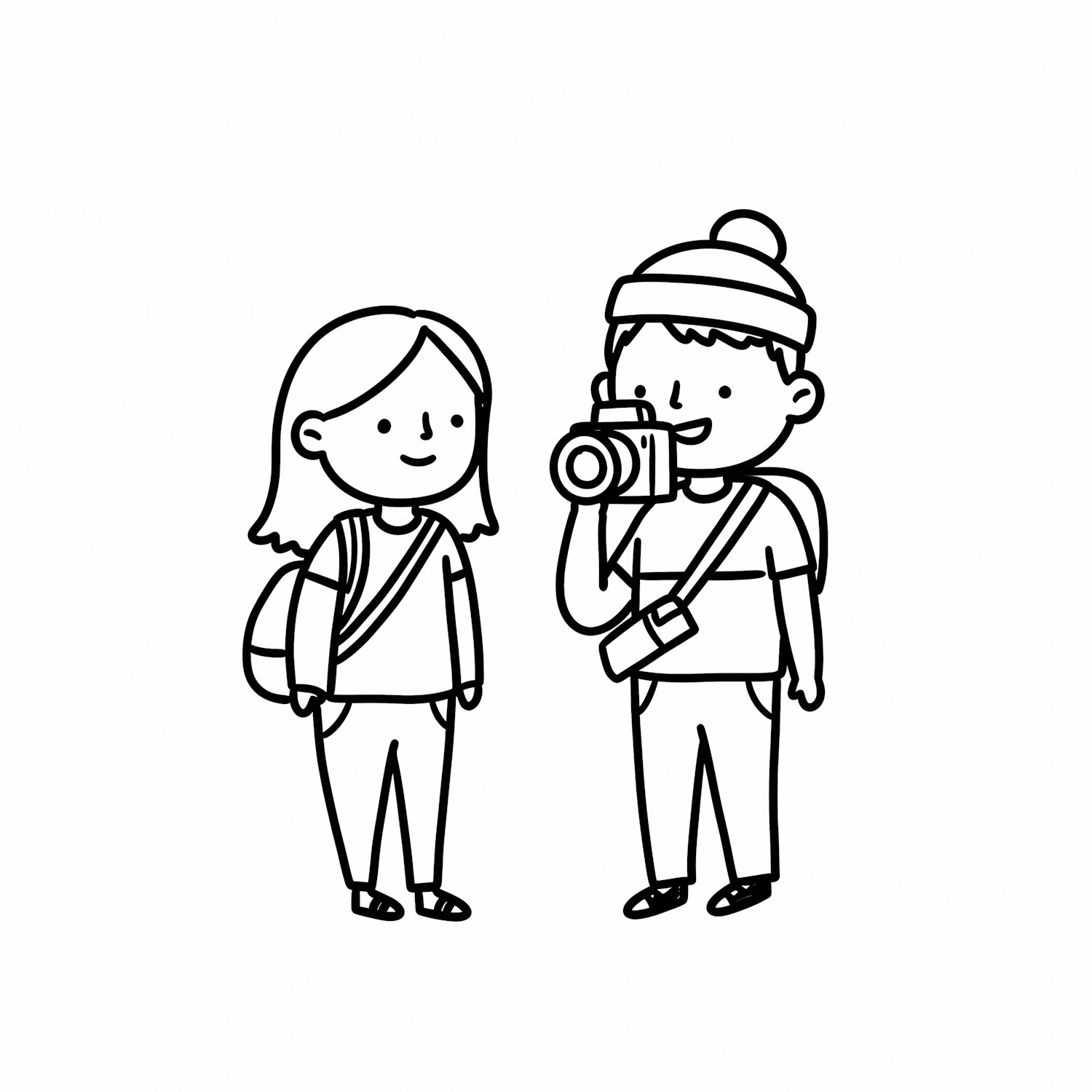 A cute black-and-white illustration of two cartoon characters, one holding a camera and the other with a backpack, smiling together.