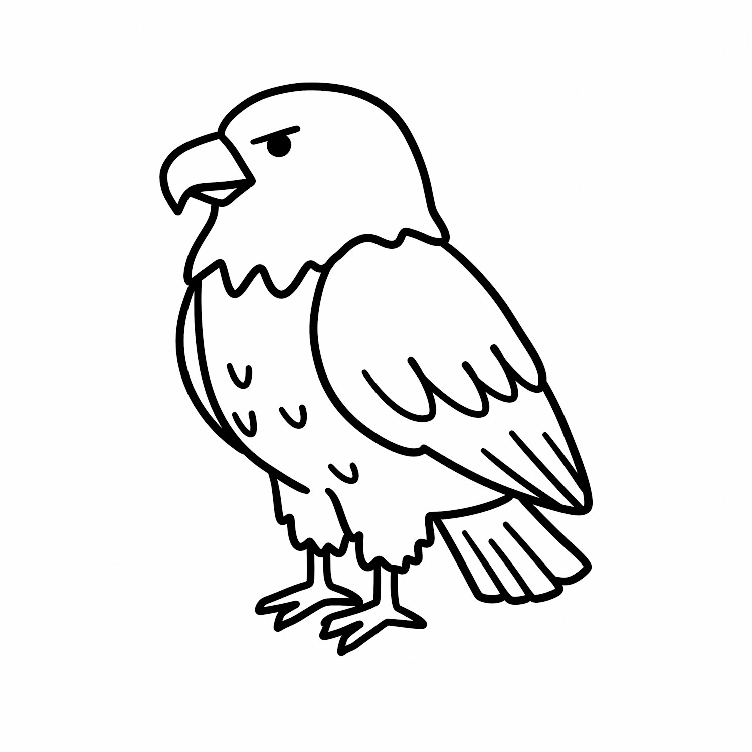 Cartoon-style black-and-white line drawing of an eagle with a stern expression, perfect for coloring or educational use.