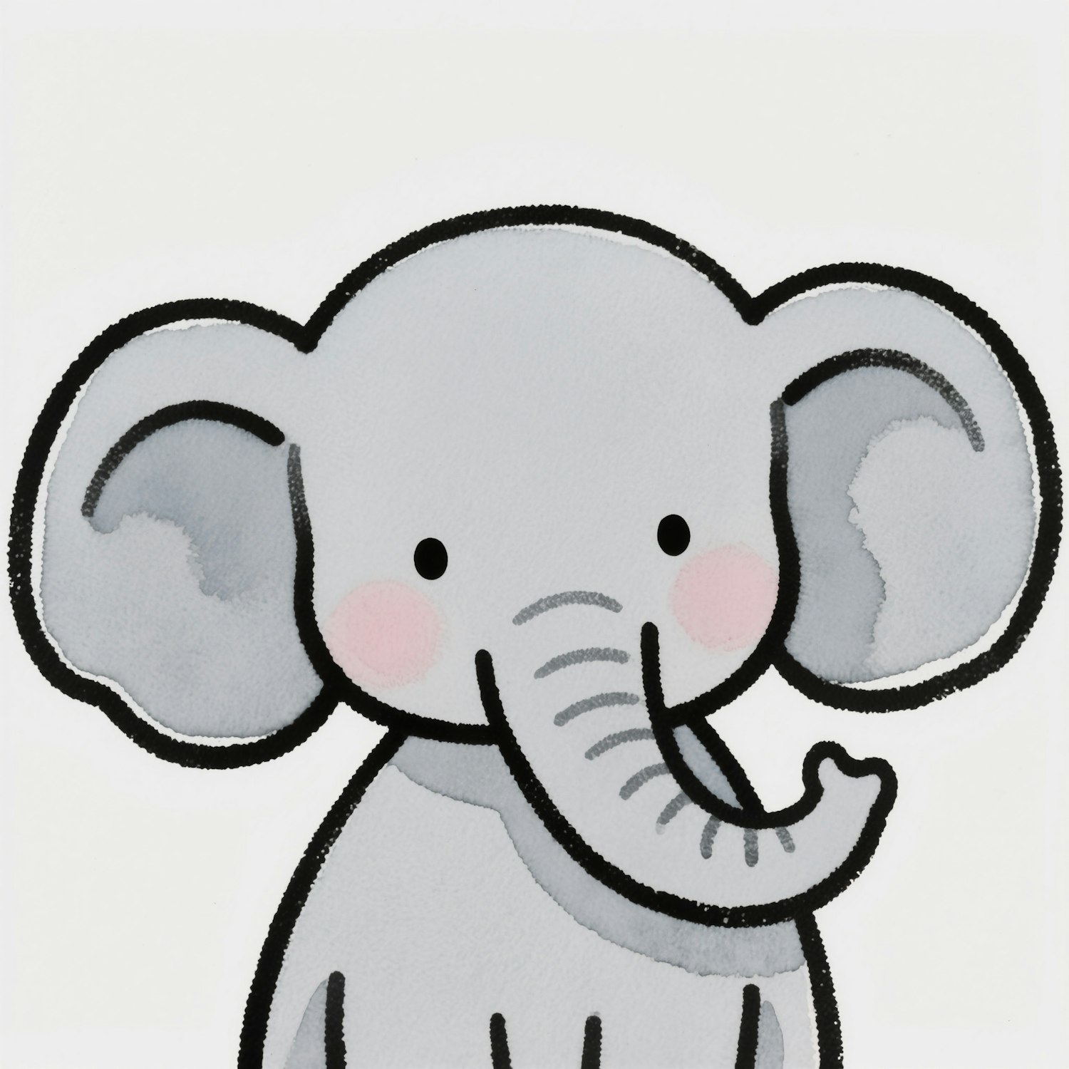 minimalist watercolor-style illustration with soft hand-drawn textures, delicate black outlines, rounded shapes, muted colors, and a clean white background. The style is childlike, friendly, and simple, with subtle blush and no heavy detail. Flat composition, no shading or lighting effects. A cute baby elephant with big floppy ears, light grey body, curved trunk pointing up, small eyes, and a pink blush on the cheek, front view only.