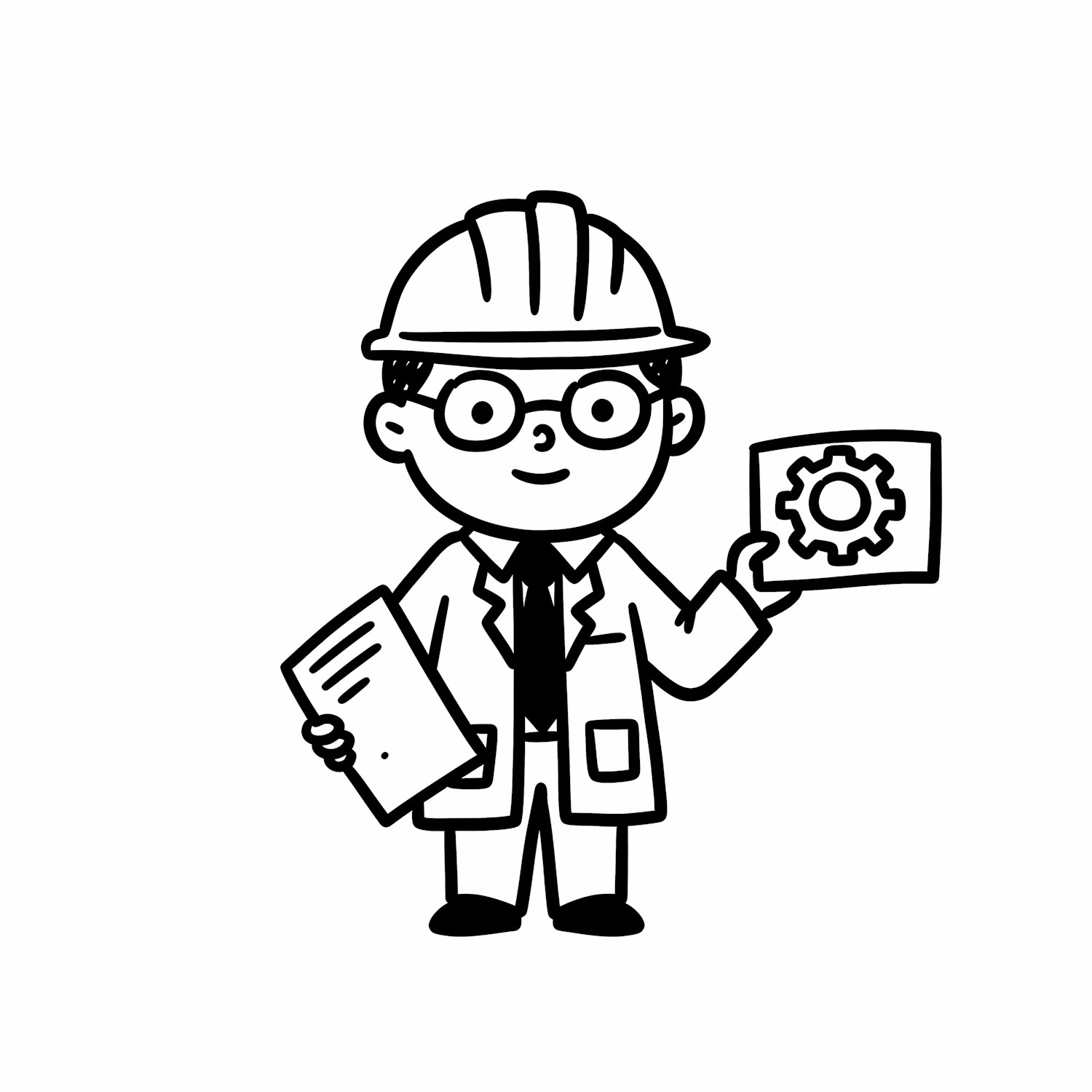 Cartoon engineer in a hard hat holding a document and gear schematic, symbolizing technical work and design in a simple line art style.