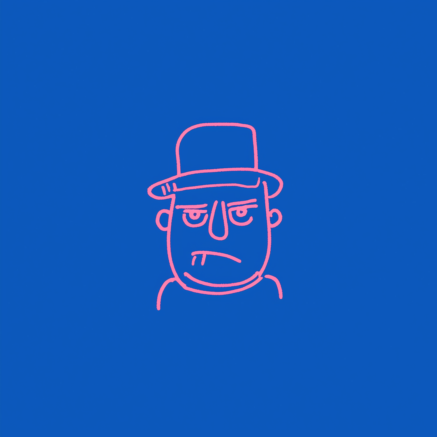 Minimalistic cartoon of a grumpy character in pink on a blue background, featuring a hat and a frown.