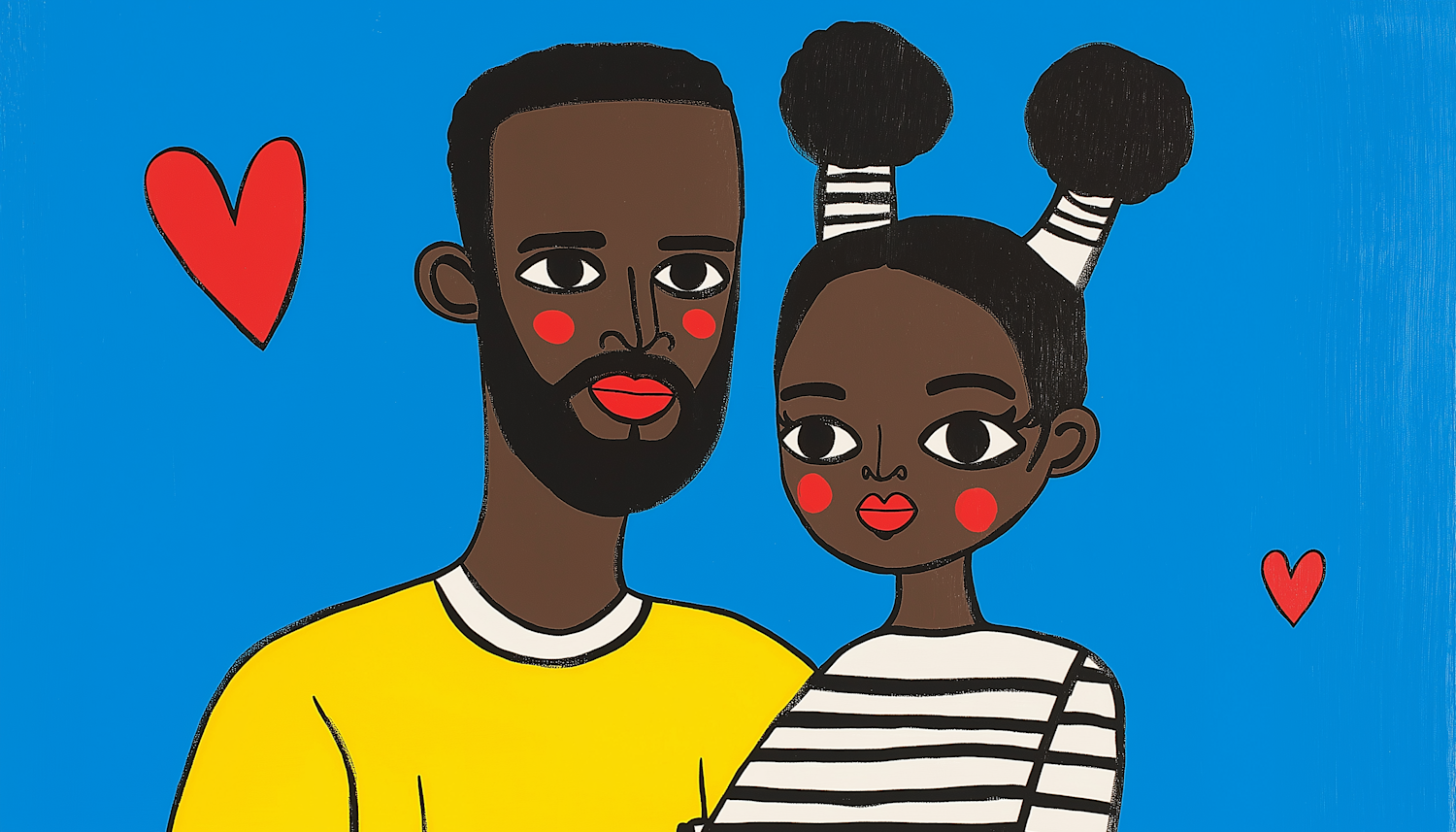 Colorful illustration of a black man and girl with hearts, showcasing love and family in a bold, cartoonish style.