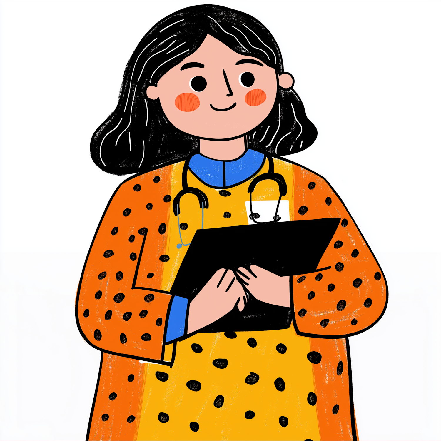 Cheerful cartoon doctor with black hair, orange polka dot coat, and stethoscope, holding a clipboard. Bright and friendly illustration.