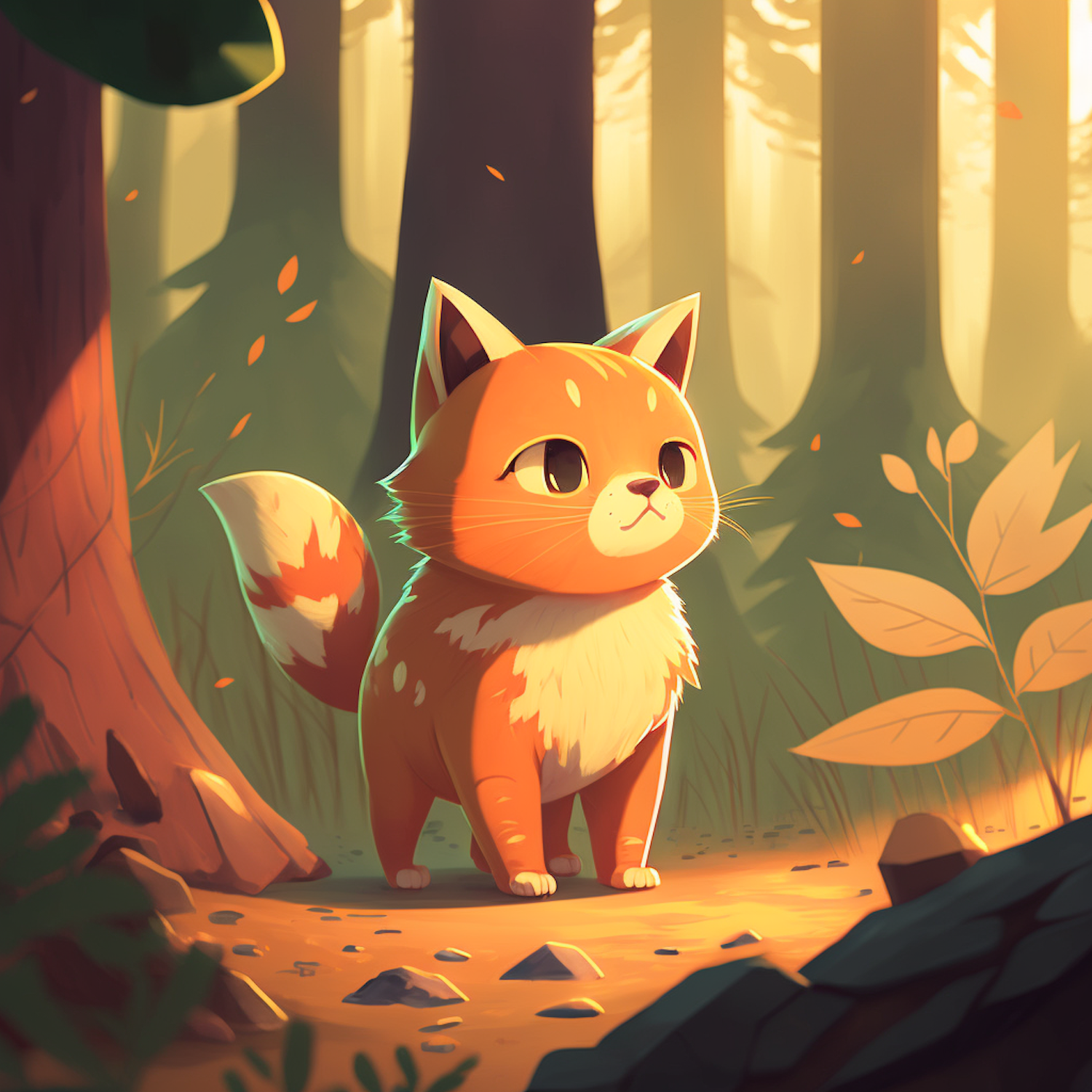 Adorable cartoon orange cat with fluffy tail in a sunlit forest, surrounded by trees and leaves. Warm, whimsical, and adventurous scene.