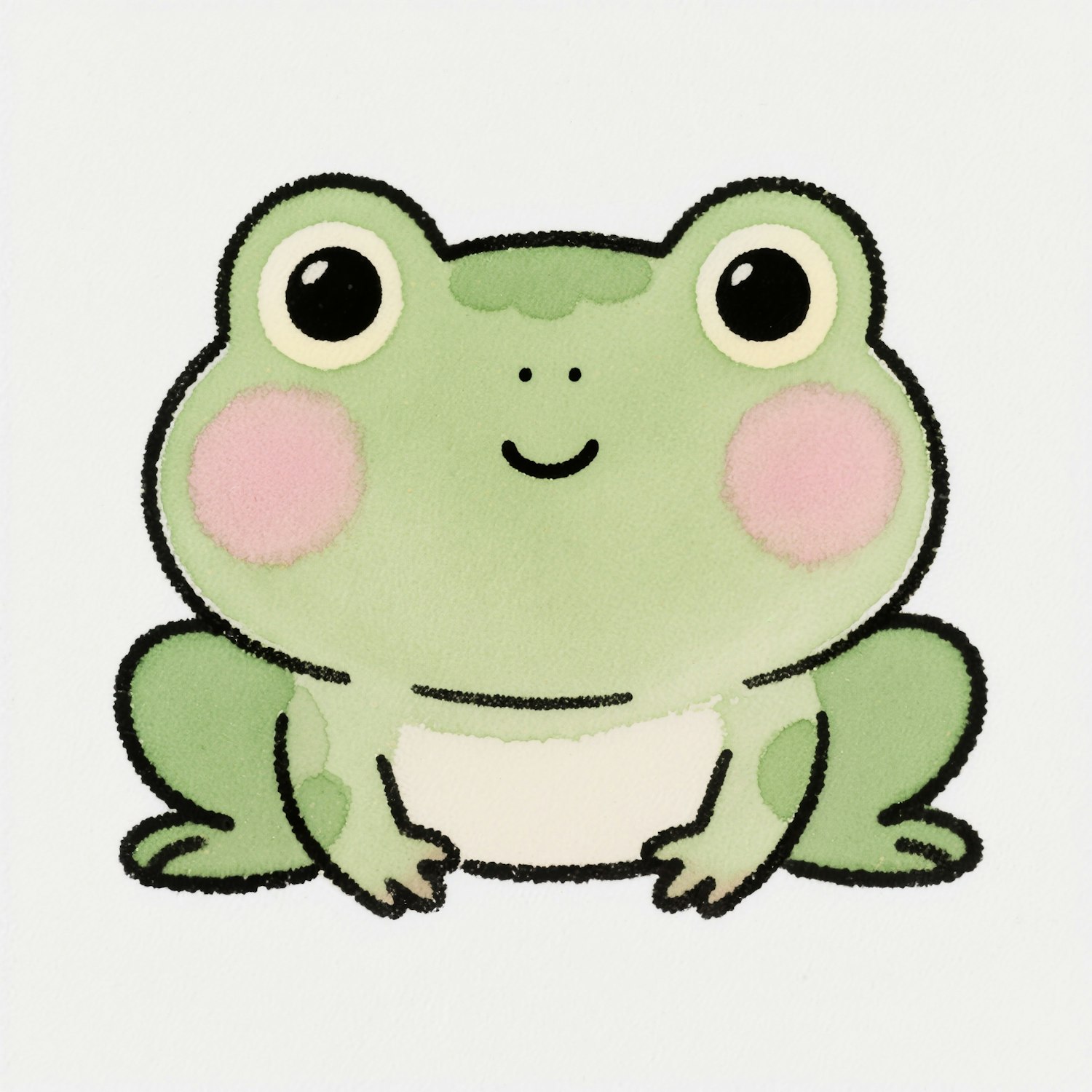 Adorable cartoon frog illustration with pink cheeks and a happy expression, perfect for kids' designs or cheerful decor.
