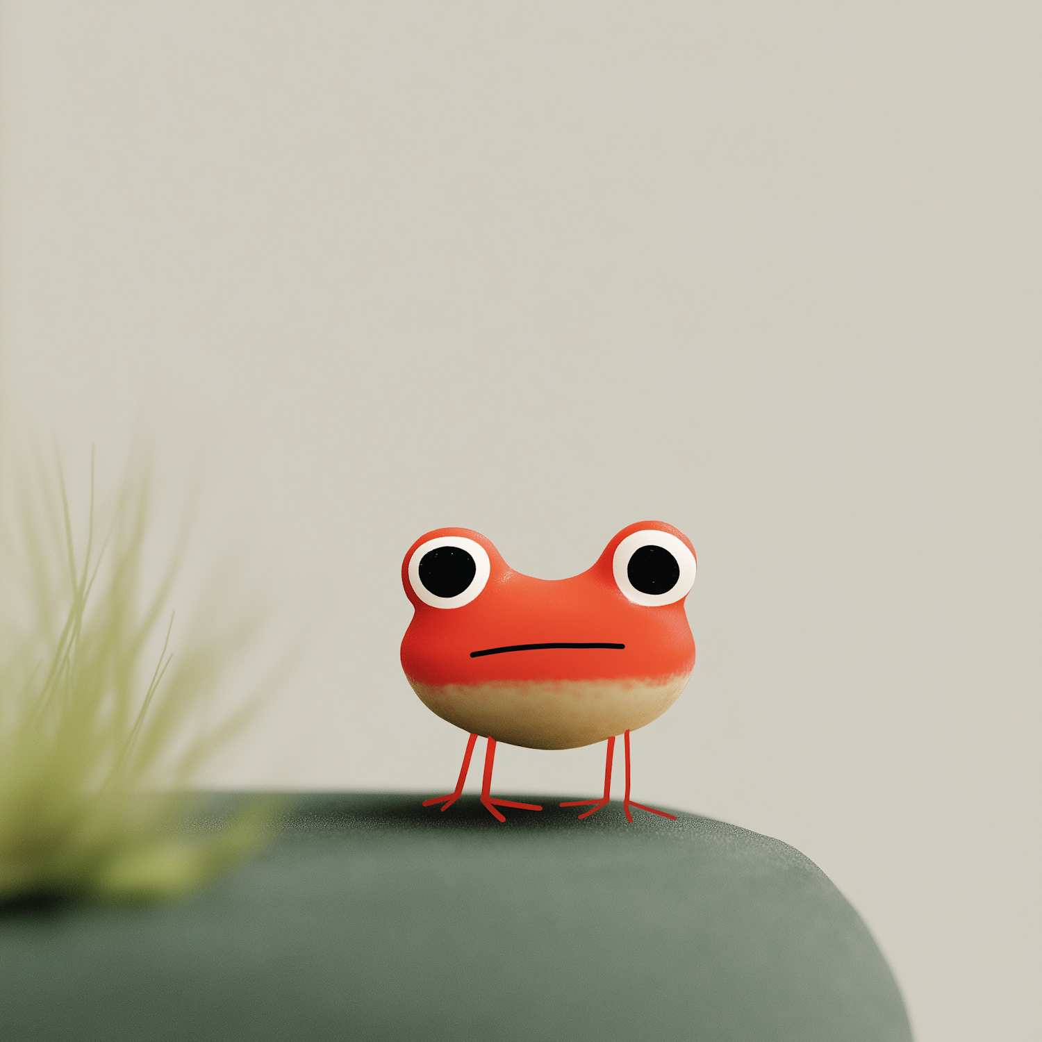 Adorable 3D cartoon frog with big eyes and a bright orange body, standing on a green surface with a soft beige background.
