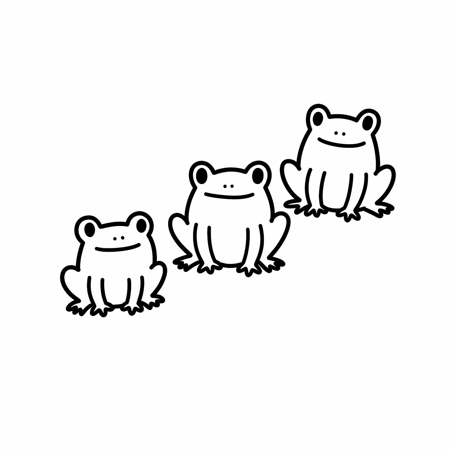 A minimalist black-and-white illustration of three cheerful cartoon frogs sitting in a diagonal line on a plain background.