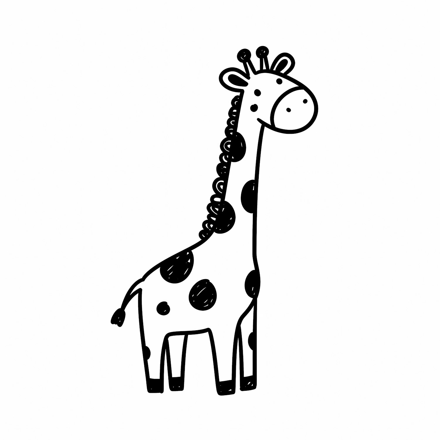 A cute black-and-white cartoon giraffe with spots and a curly mane, drawn in a simple and playful style on a white background.
