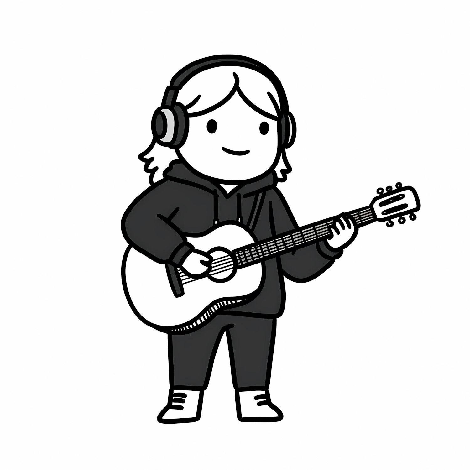 Cartoon character in headphones playing an acoustic guitar, wearing a hoodie, in a simple black-and-white illustration.