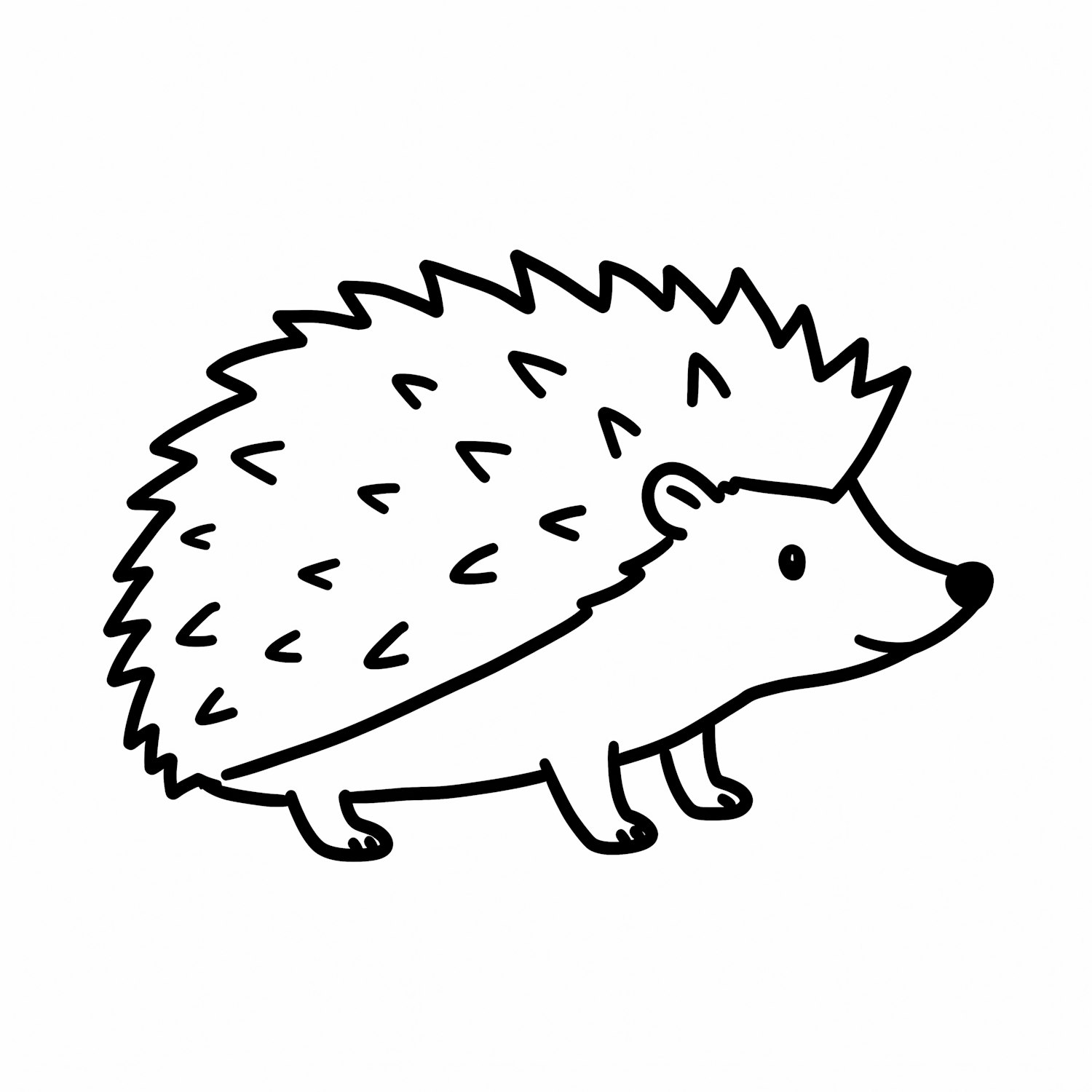 A cute black-and-white cartoon drawing of a hedgehog with spiky quills and a friendly expression, perfect for coloring or decoration.
