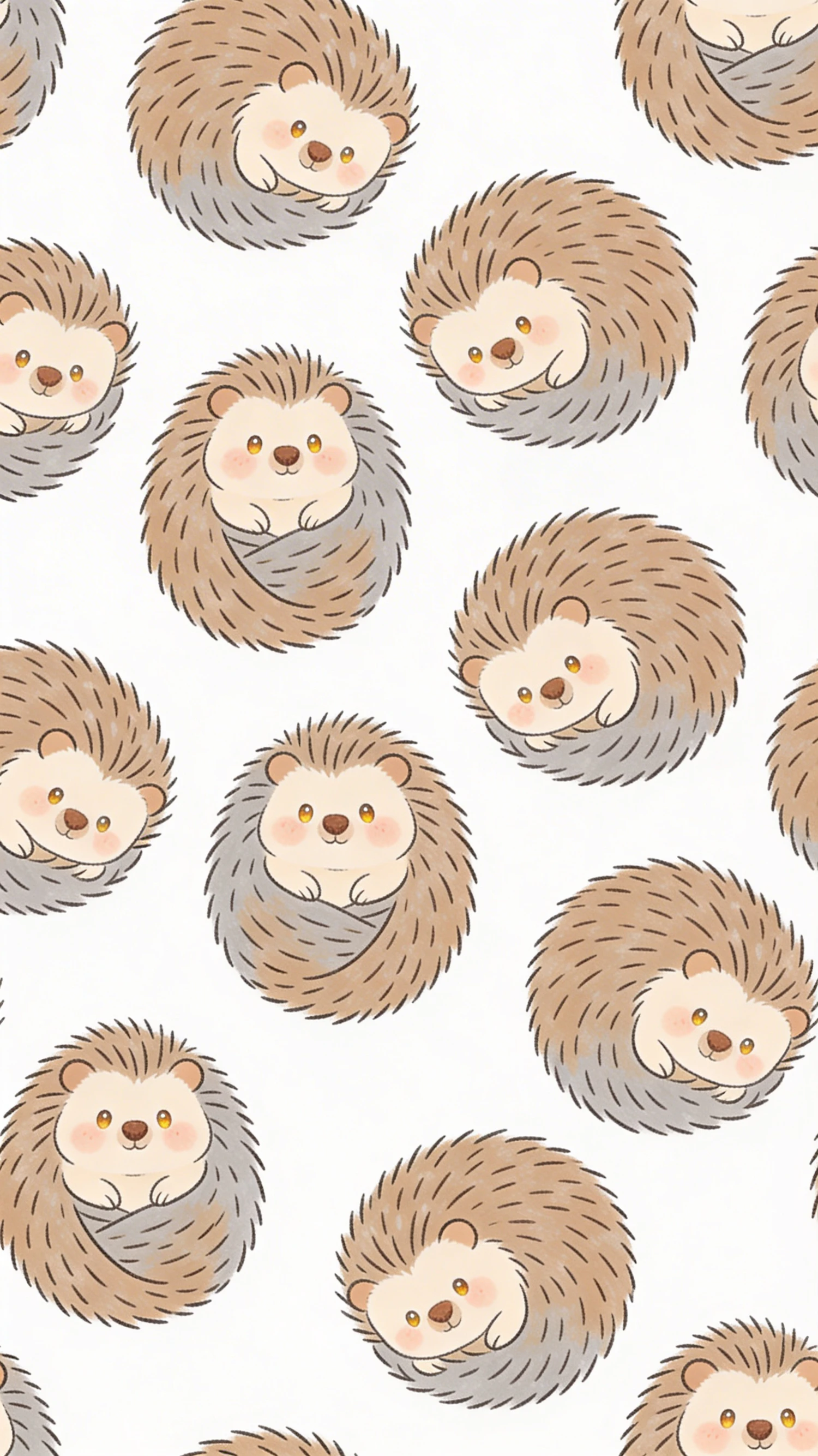 Cute cartoon hedgehogs in a seamless pattern, curled up with cheerful expressions on a white background, perfect for designs.