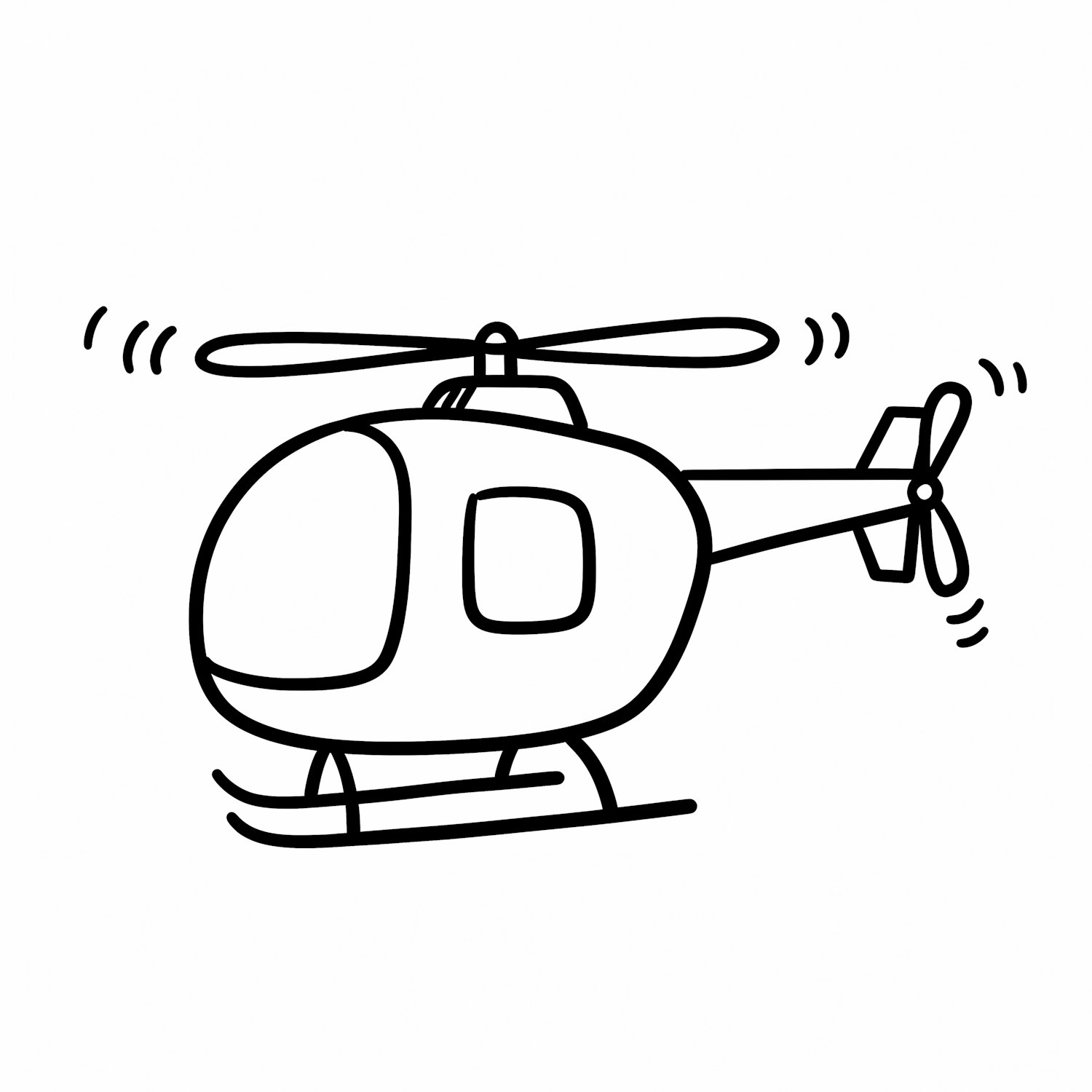 A clean black-and-white line drawing of a helicopter with rotors in motion, featuring a simple and cartoonish design.