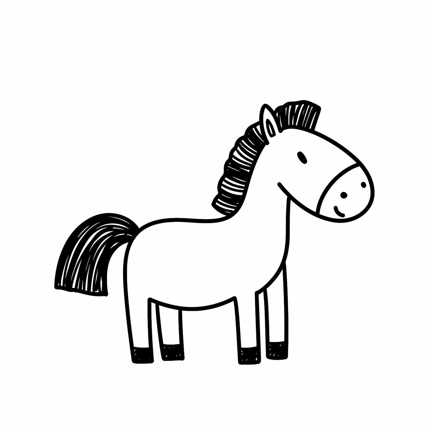 A cute black-and-white cartoon horse illustration with a simple and playful design, perfect for kids' projects or coloring activities.