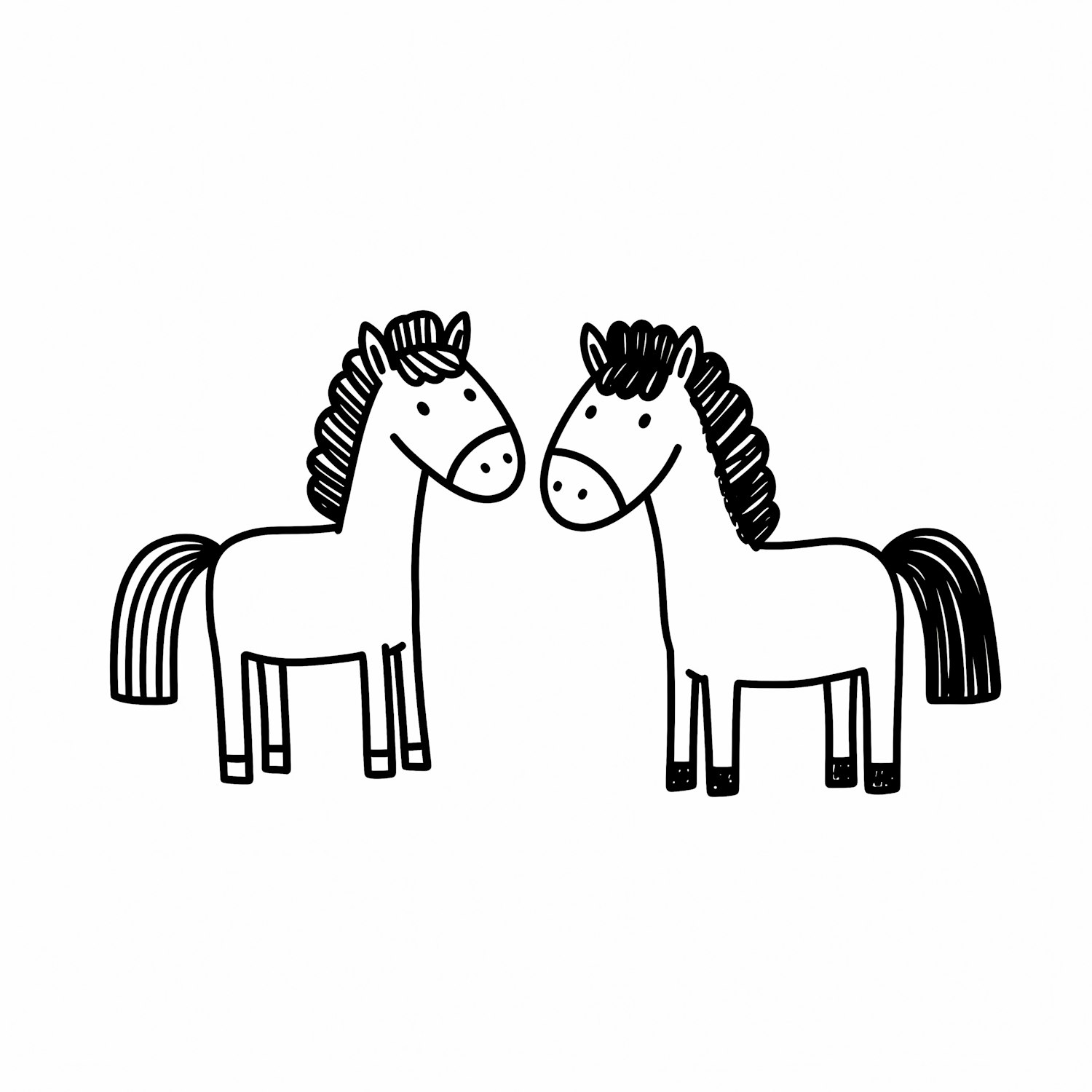 A charming black-and-white cartoon illustration of two horses facing each other, drawn with simple lines and playful details.