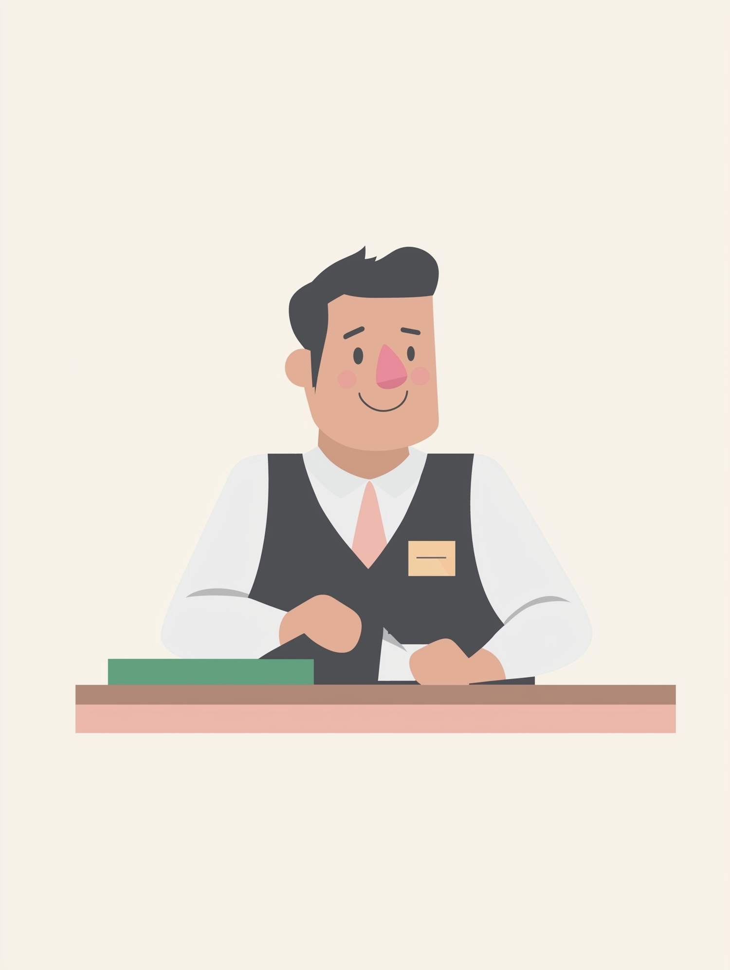 Cartoon illustration of a smiling man in a vest and tie, sitting at a desk with a name tag, suggesting a service role.