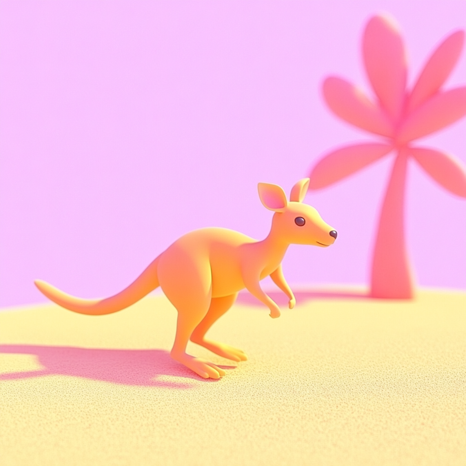 Bright 3D illustration of an orange kangaroo on a yellow surface with a pink tree, set against a soft pink background.