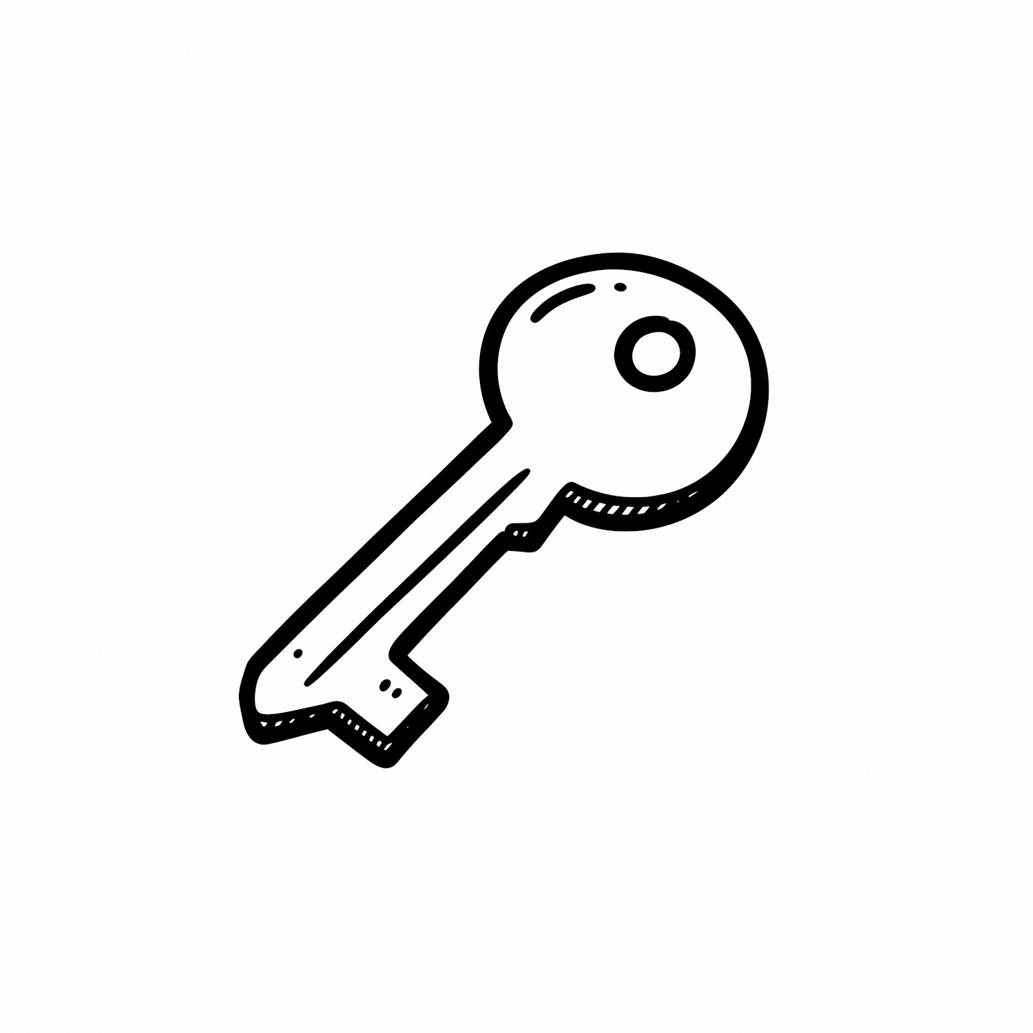 A clean black-and-white cartoon illustration of a key with a round head and a simple design, set against a plain white background.