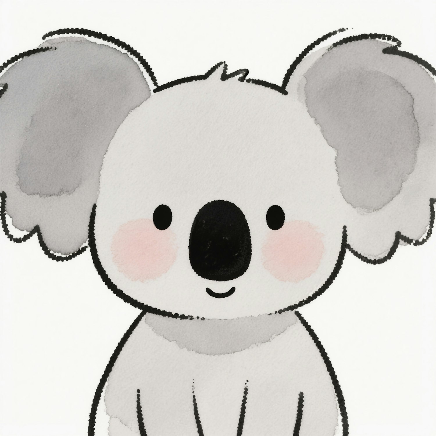 minimalist watercolor-style illustration with soft hand-drawn textures, delicate black outlines, rounded shapes, muted colors, and a clean white background. The style is childlike, friendly, and simple, with subtle blush and no heavy detail. Flat composition, no shading or lighting effects. A cute baby koala with big round grey ears, a light grey face, small black nose, and rosy cheeks, front view only.