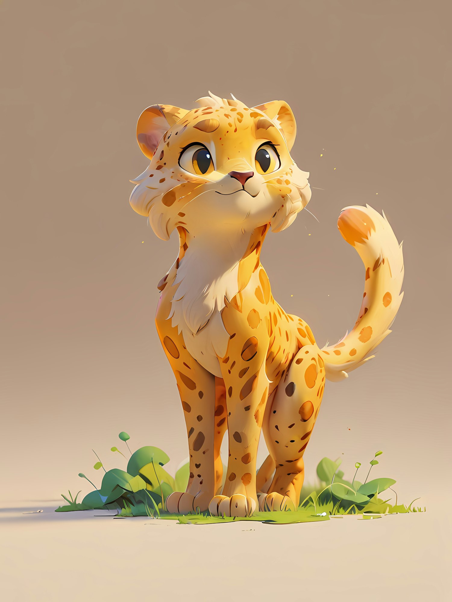 Adorable cartoon leopard cub with golden fur and orange spots, standing on grass with a neutral background. Perfect for kids' illustrations.