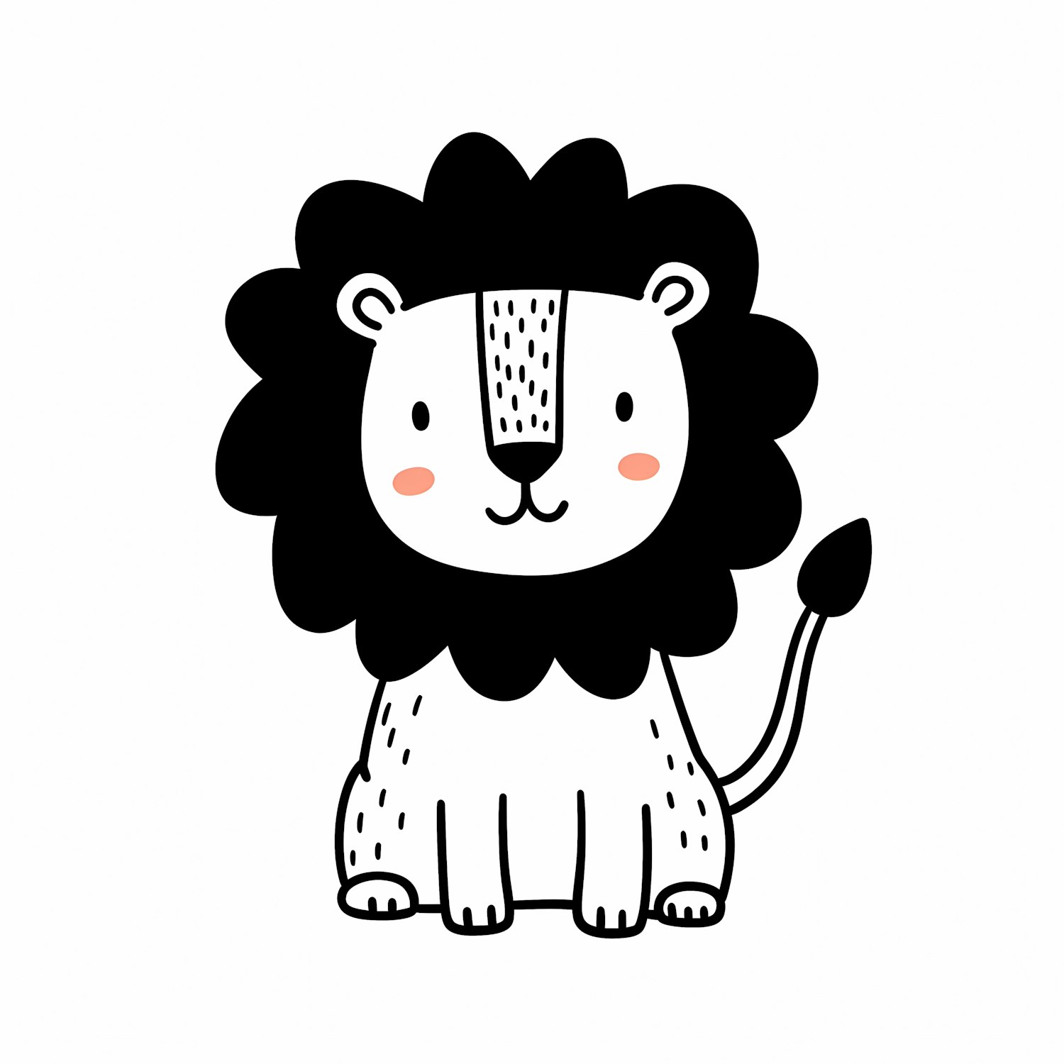Adorable cartoon lion illustration with a black mane, white body, and pink cheeks, perfect for kids' designs or playful themes.