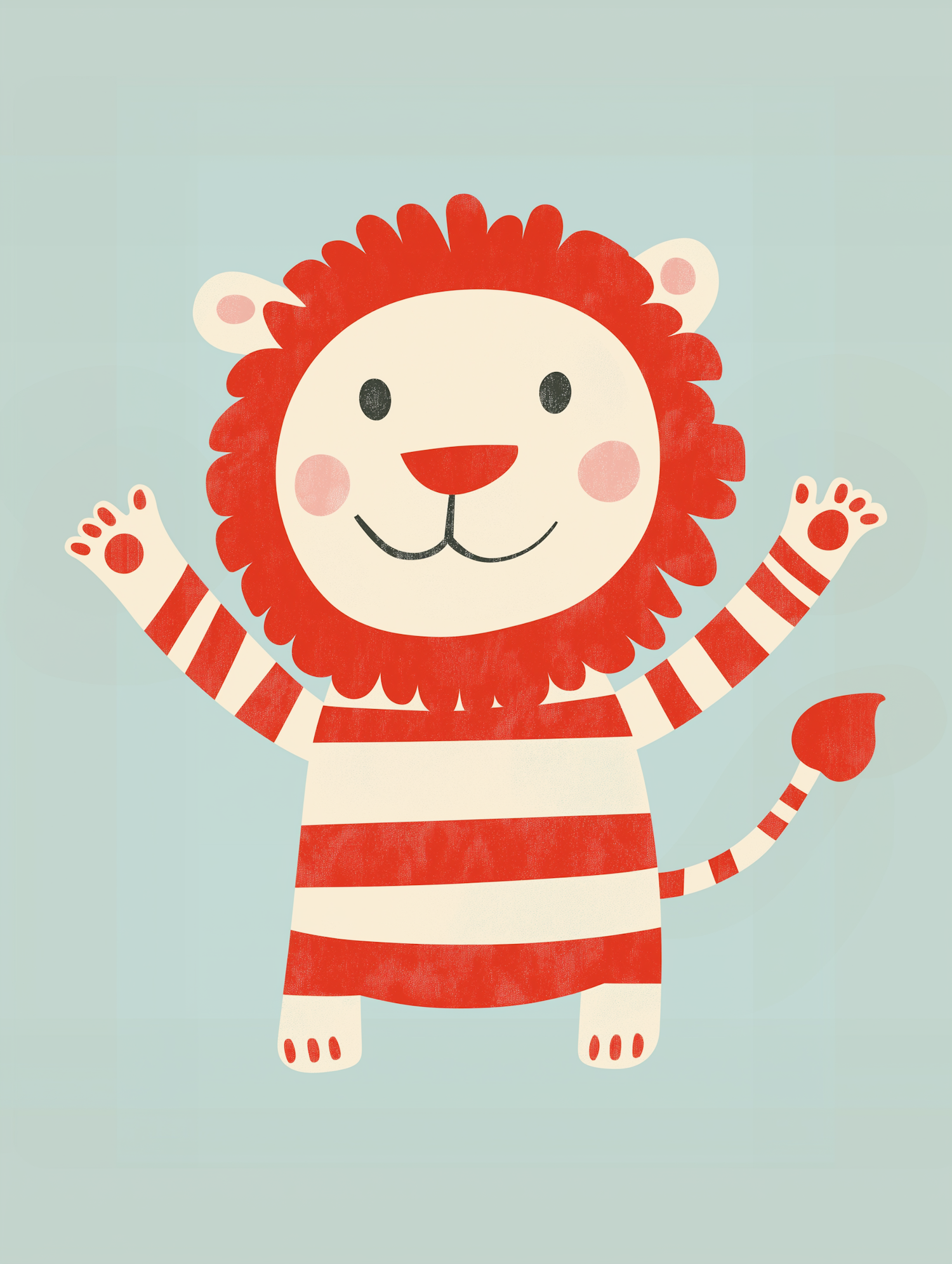 Adorable cartoon lion with a red mane and striped body, waving cheerfully on a pastel green background. Perfect for kids' designs!