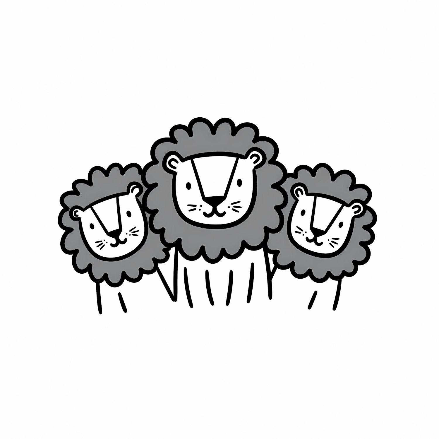 A charming black-and-white cartoon illustration of three lions with cheerful expressions and scalloped manes, set against a plain background.